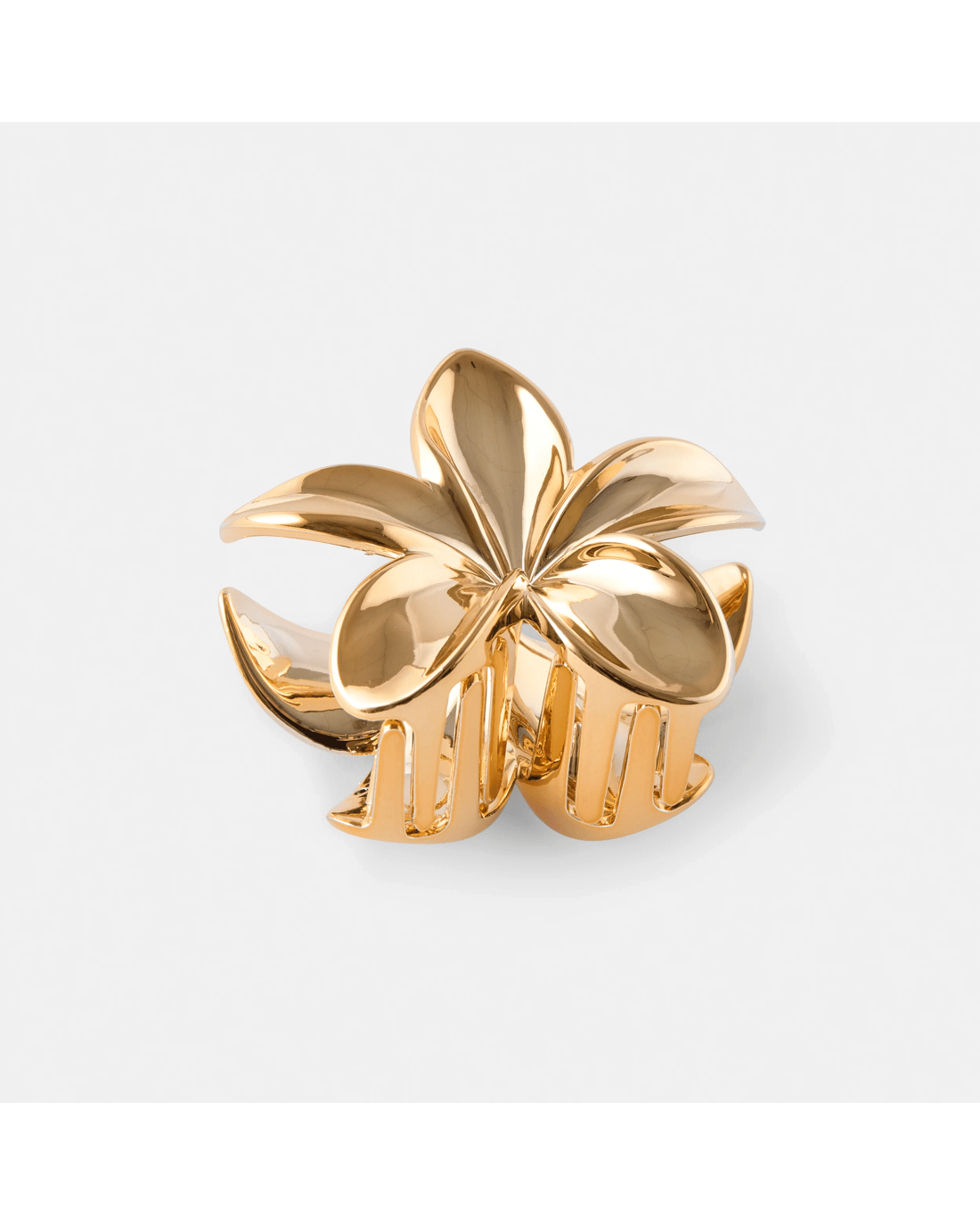 Elevate your hairstyle with the Gold Tone Frangipani Claw Hair Clip - elegant and effortlessly chic. Its floral design adds a touch of tropical charm to any look, day or night.
