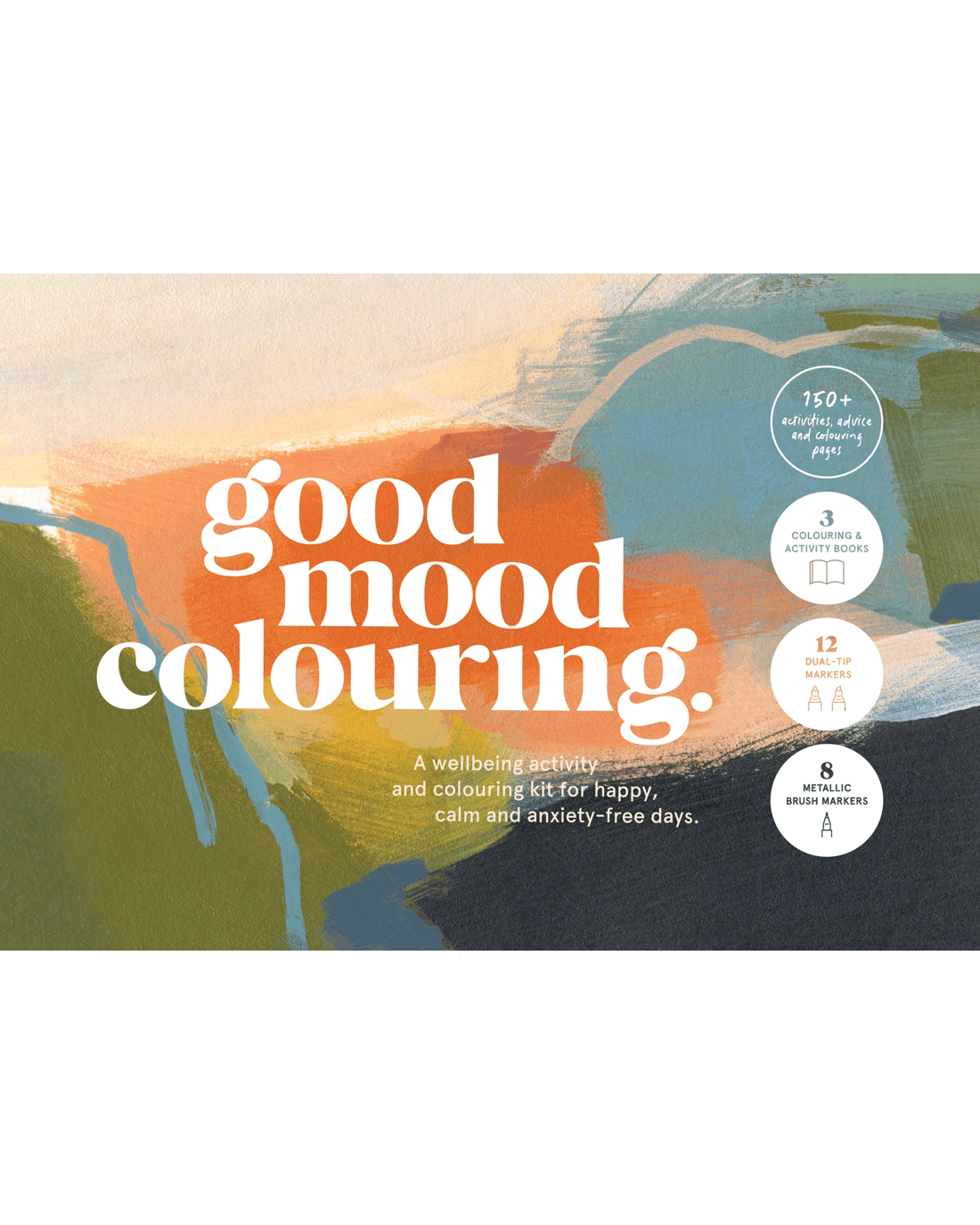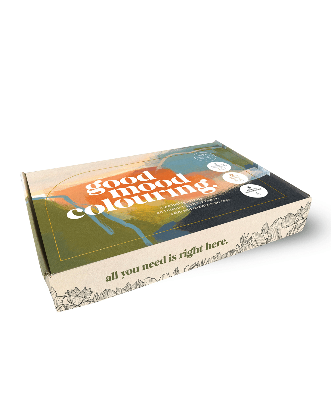 A wellbeing activity and colouring kit for happy, calm and anxiety-free days. The good things. This gorgeous wellbeing kit contains over 150 illustrations, advice and journalling activities and high-quality double-ended markers and metallic brush markers to help you create something special. Just add a little time. Time for you.