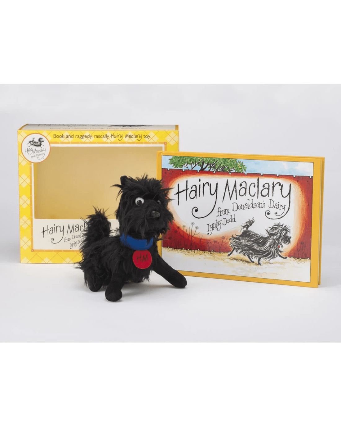 A boxed gift set containing a hardback edition of Hairy Maclary from Donaldson's Dairy and a cuddly Hairy Maclary toy.