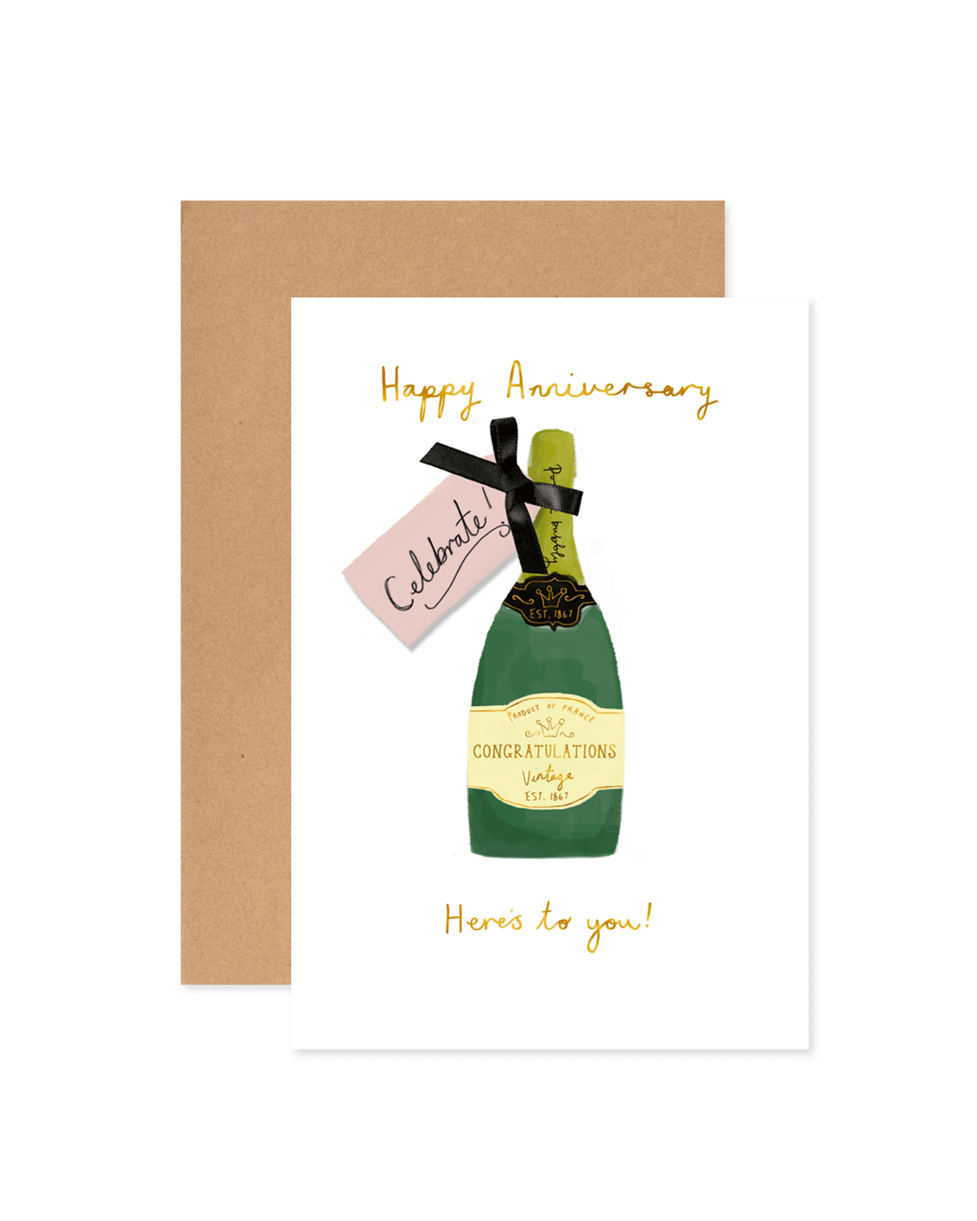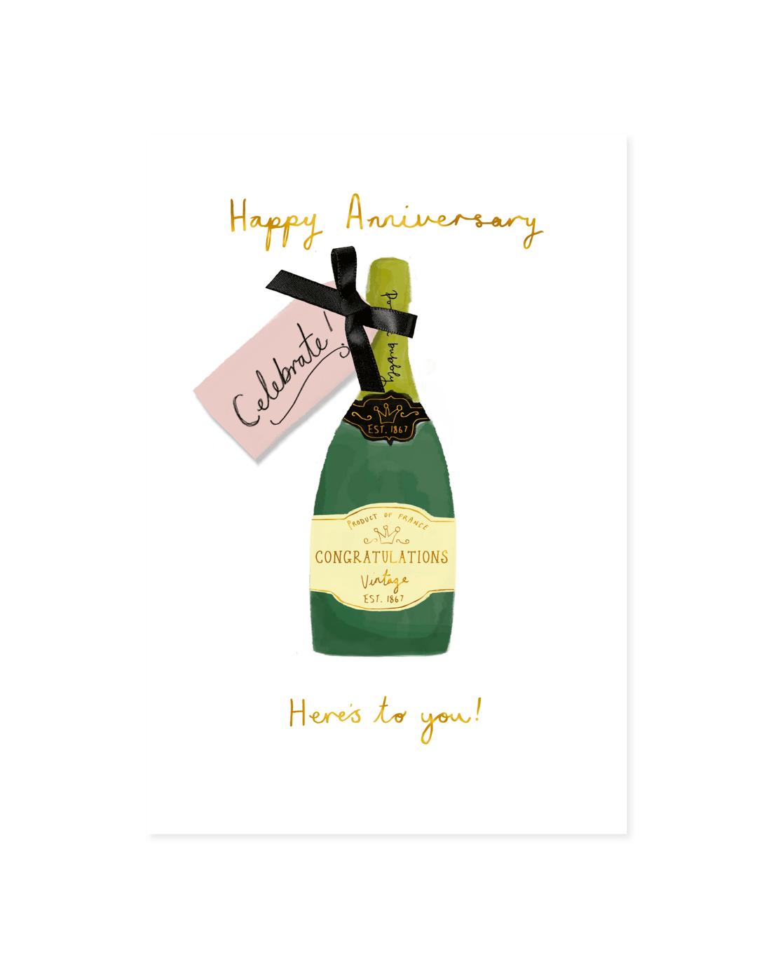 • The front of the card features gold foil text and detailing with a champagne bottle illustration. The message reads 'Happy Anniversary. Here's to you!'