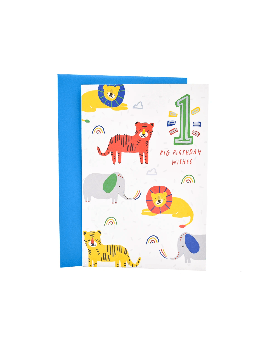 Features- This cover features colourful tigers, lions, elephants and mini rainbows, along with the message '1 Big Birthday Wishes'. The cover also features silver foil detail, rainbows and clouds which are also featured on the inside cover of the card