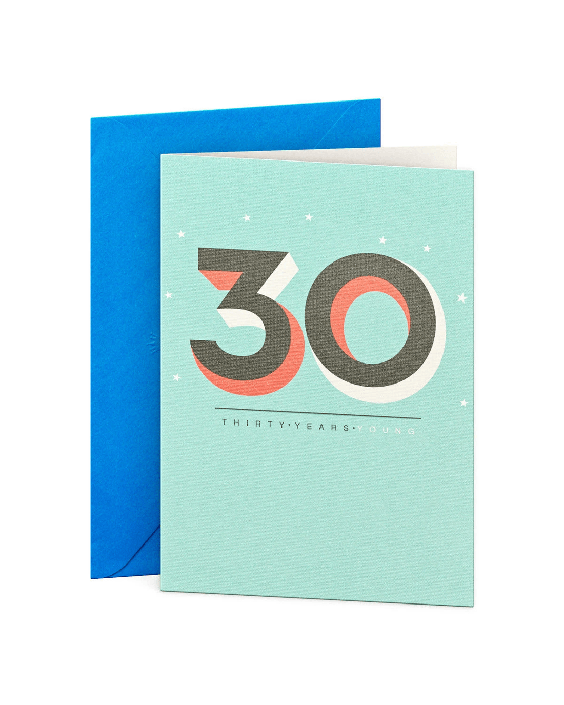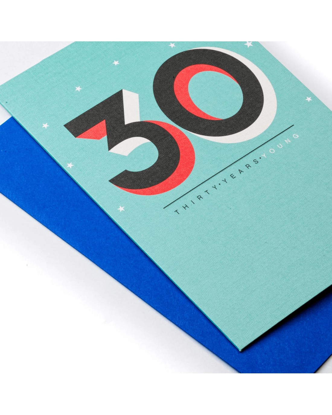 • The front cover features a pressed card background with a large number 30 and text that reads: Thirty years young