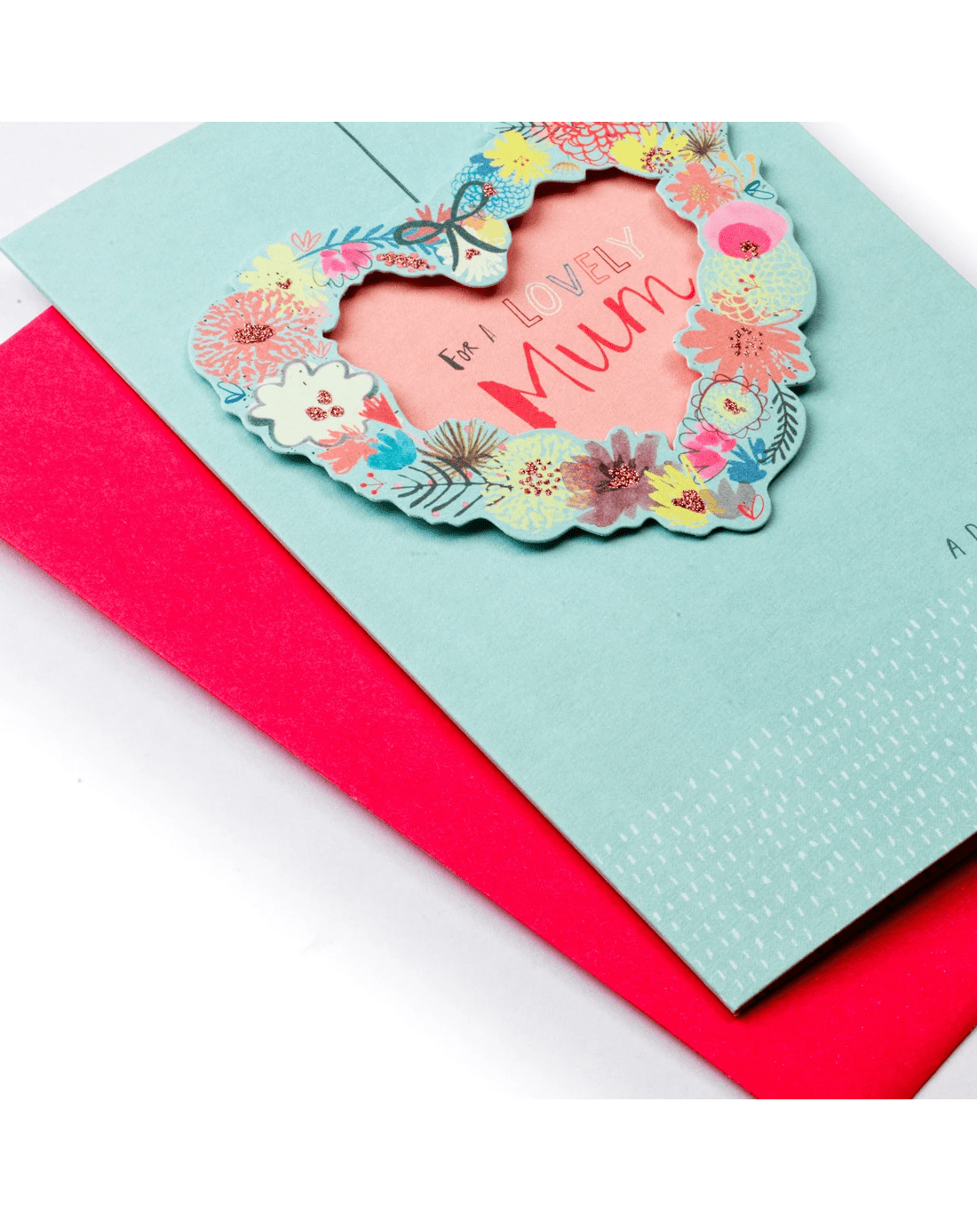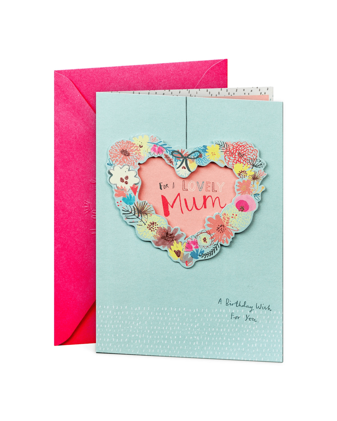 • The front cover features a lovely floral cut-out heart decoration with glitter accents and the message reads: For a lovely mum.A birthday wish for you.