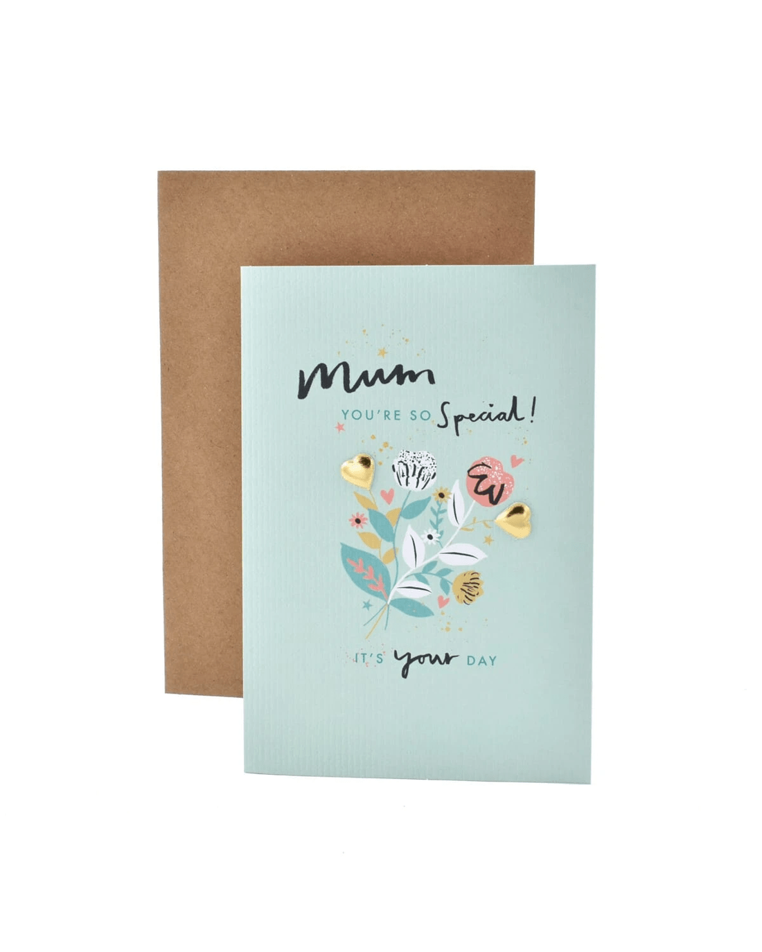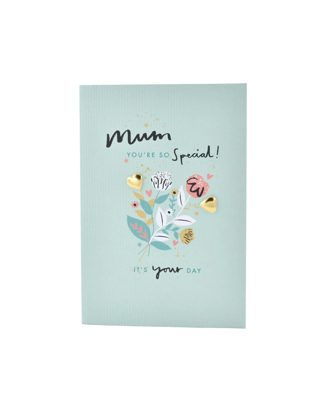 • The front of the card is textured and features gold foil highlights, 3D heart attachments, a beautiful illustration of flowers, and the message 'mum YOU’RE SO Special IT’S your DAY'