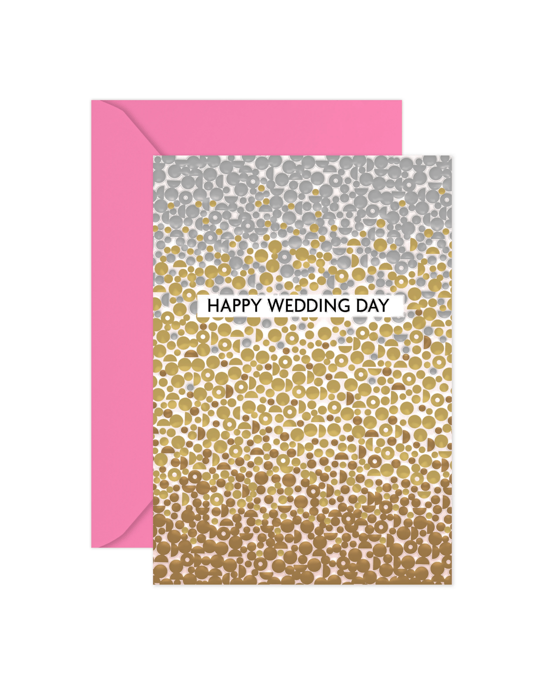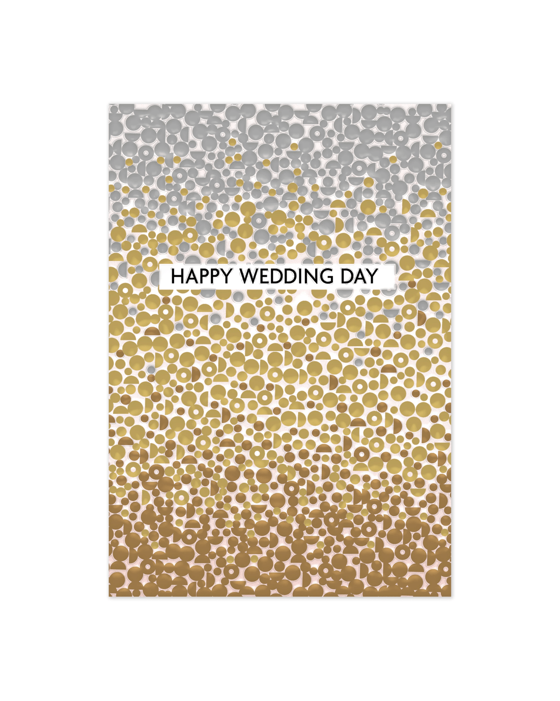 - Front of card features a gold, silver and bronze foiled design with the message: 'Happy Wedding Day'.