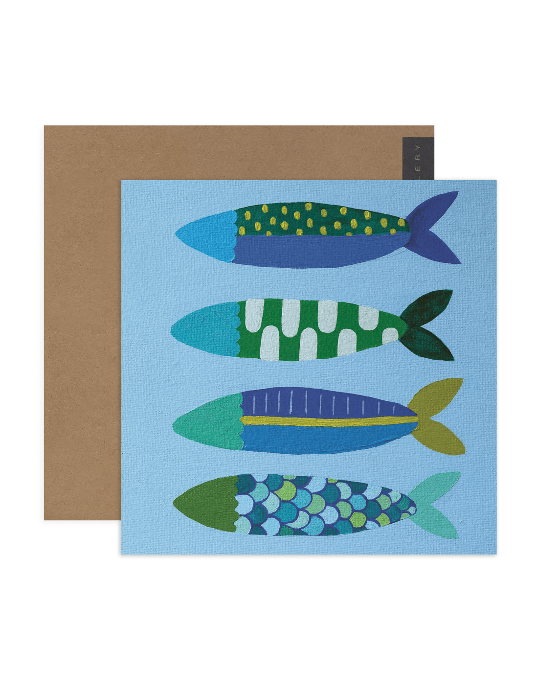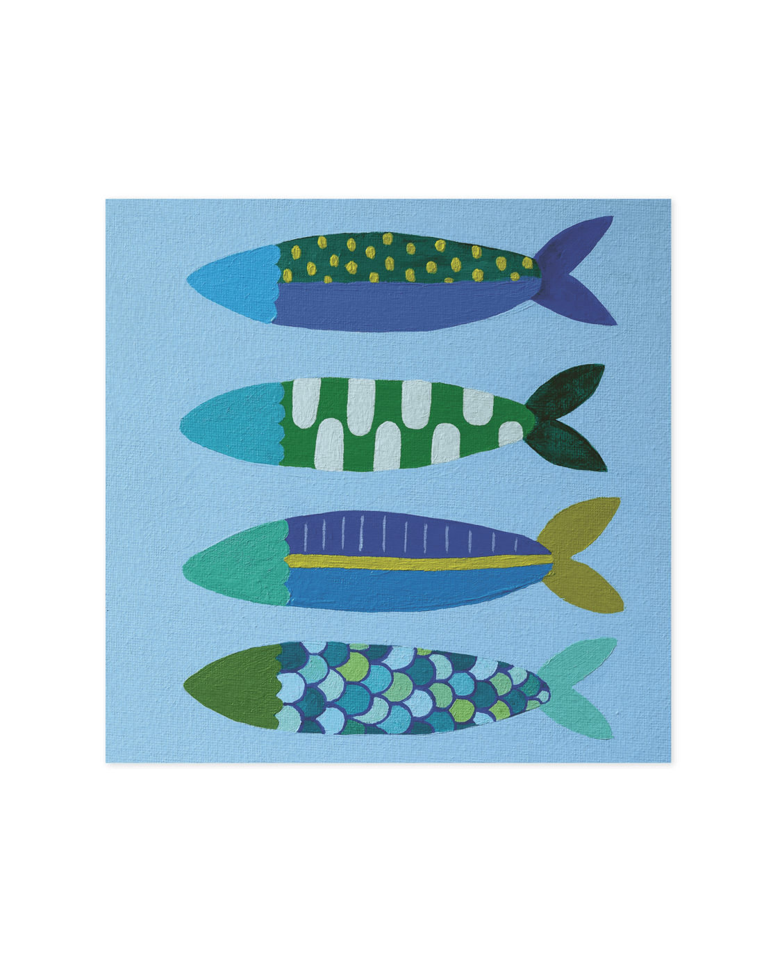 • The front of the card features a print of a canvas artwork by Australian artist Kayla Henley of four horizontal blue and green fish on a light blue background