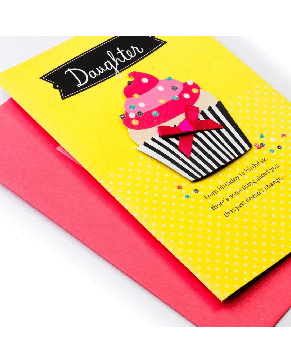 • Adorned with glitter sprinkles, rand ribbon on a pop out cupcake