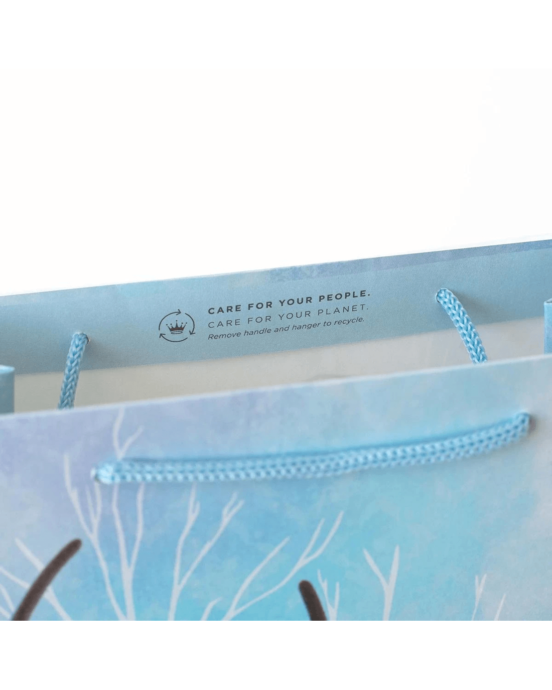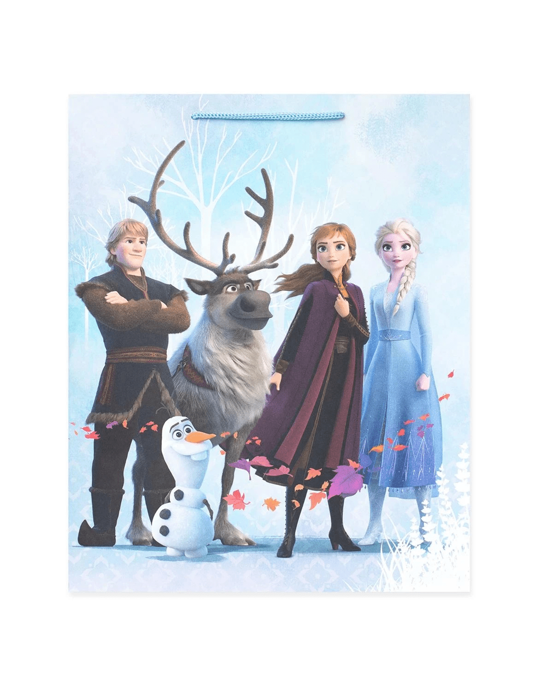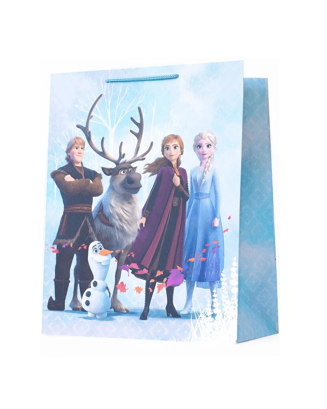 The gift bag features an illustration of Frozen characters with an iced blue backdrop and blue carry handles.