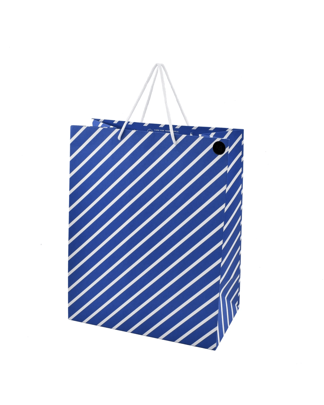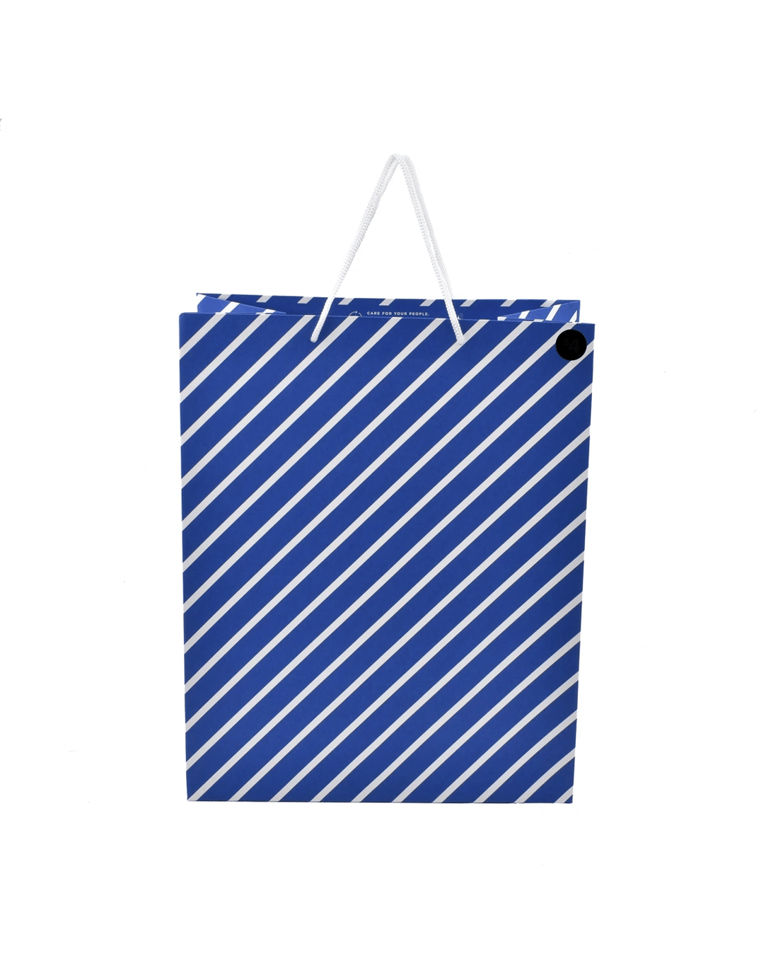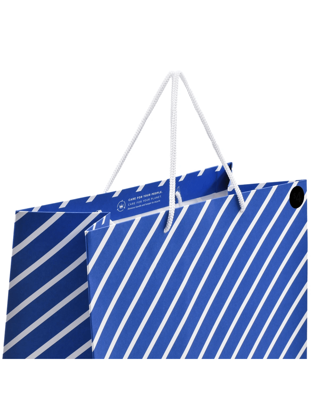 • Featuring a blue background with diagonal white stripes, and a white rope handle