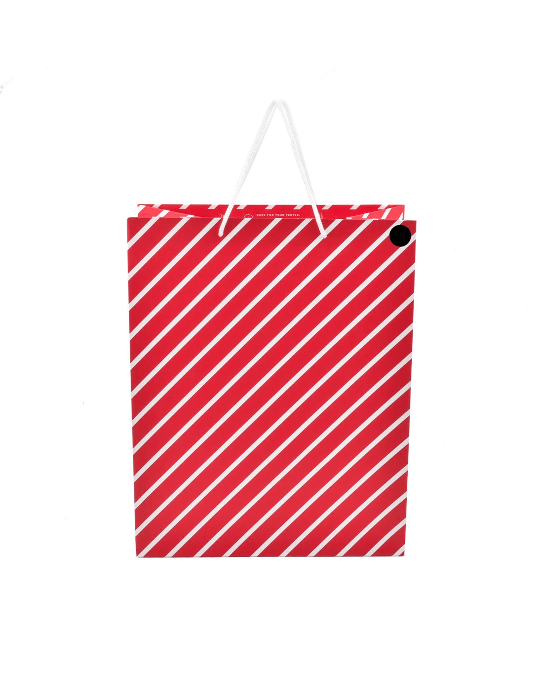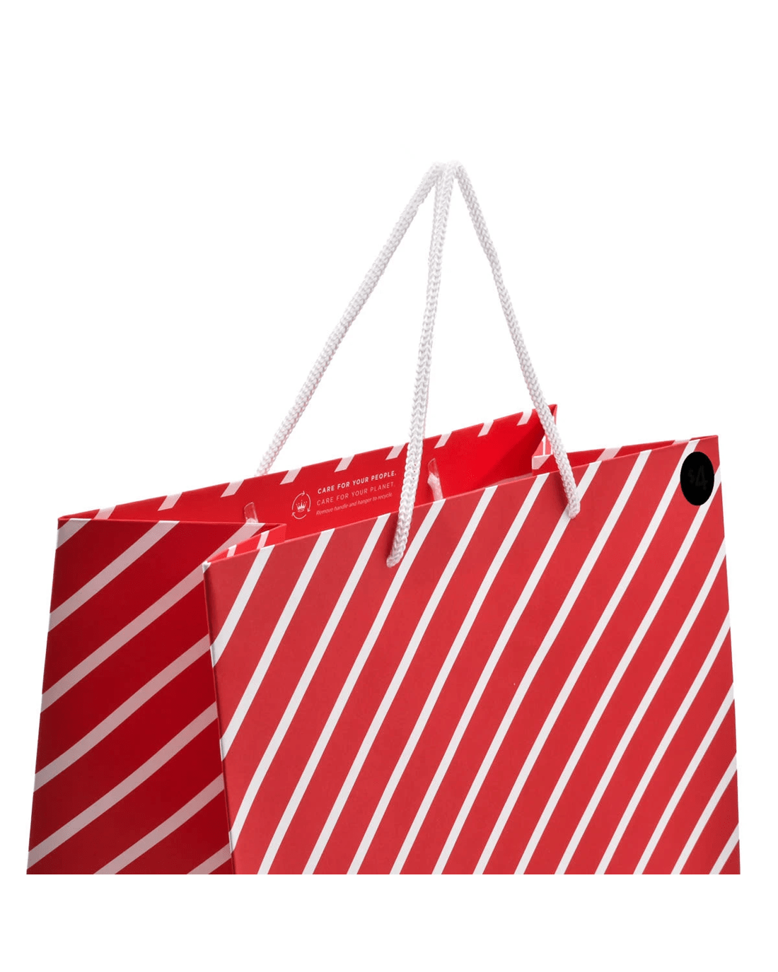 • Featuring a red background with diagonal white stripes, and a white rope handle