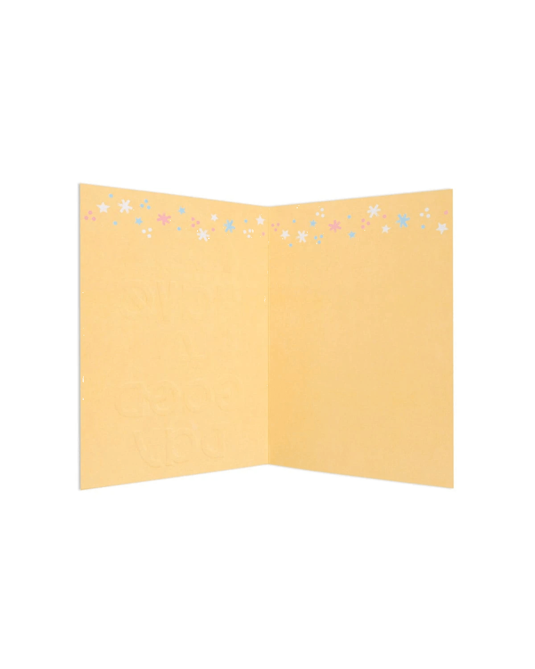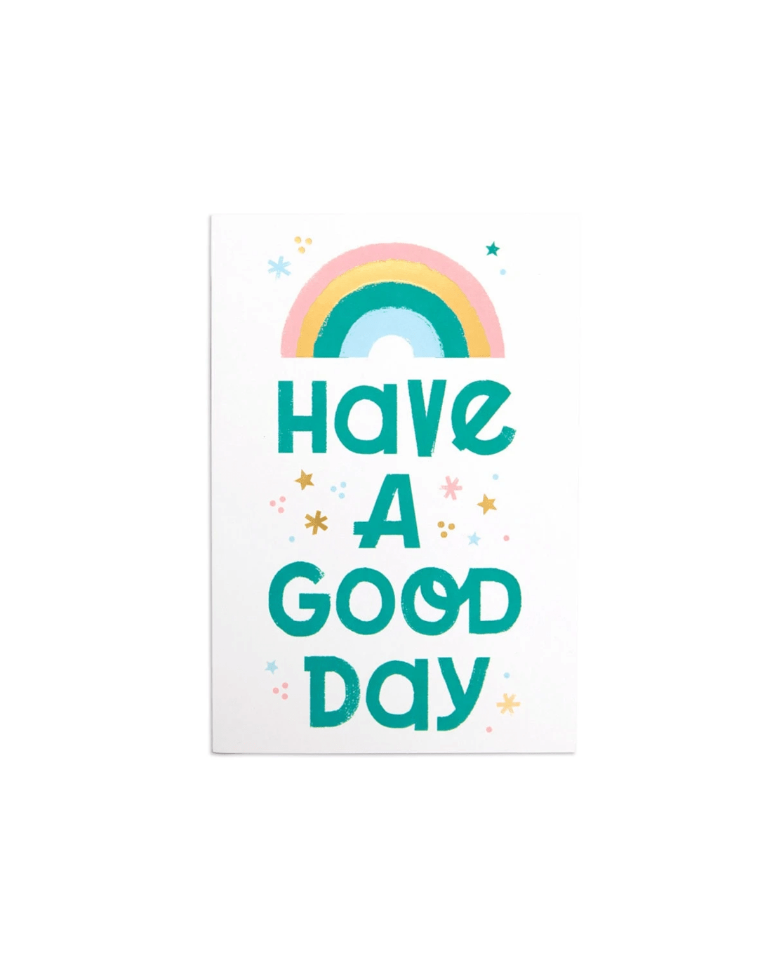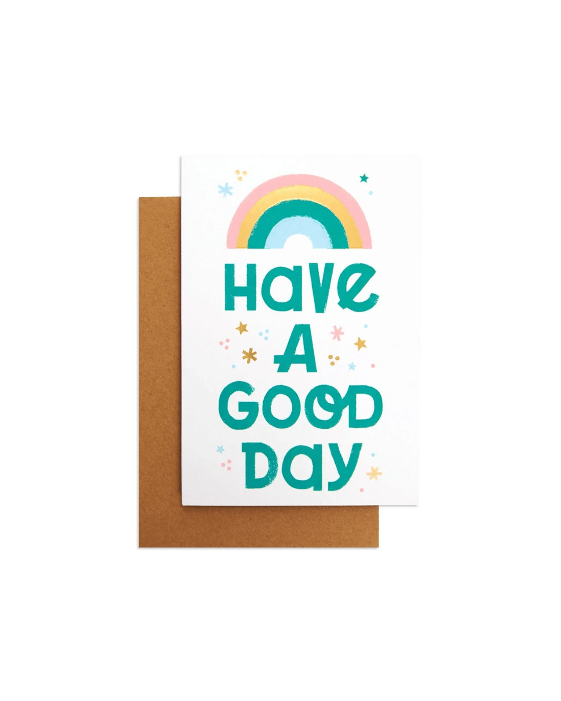 - The front of the card features gold foil highlights, embossed elements, a colourful illustration of a rainbow and stars, and the message 'HAVE A GOOD DAY'