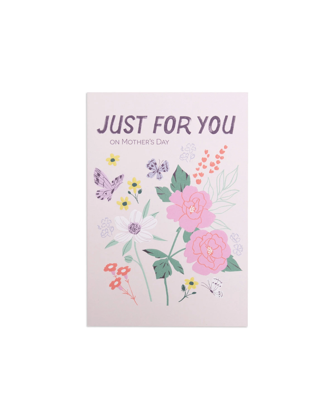 • The front of the card features debossed detailing, beautiful colourful illustrations of flowers and butterflies and the message 'JUST FOR YOU ON MOTHER'S DAY'