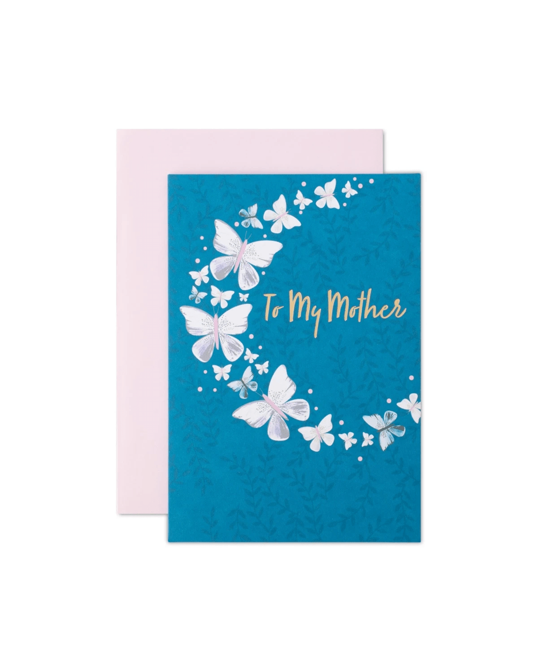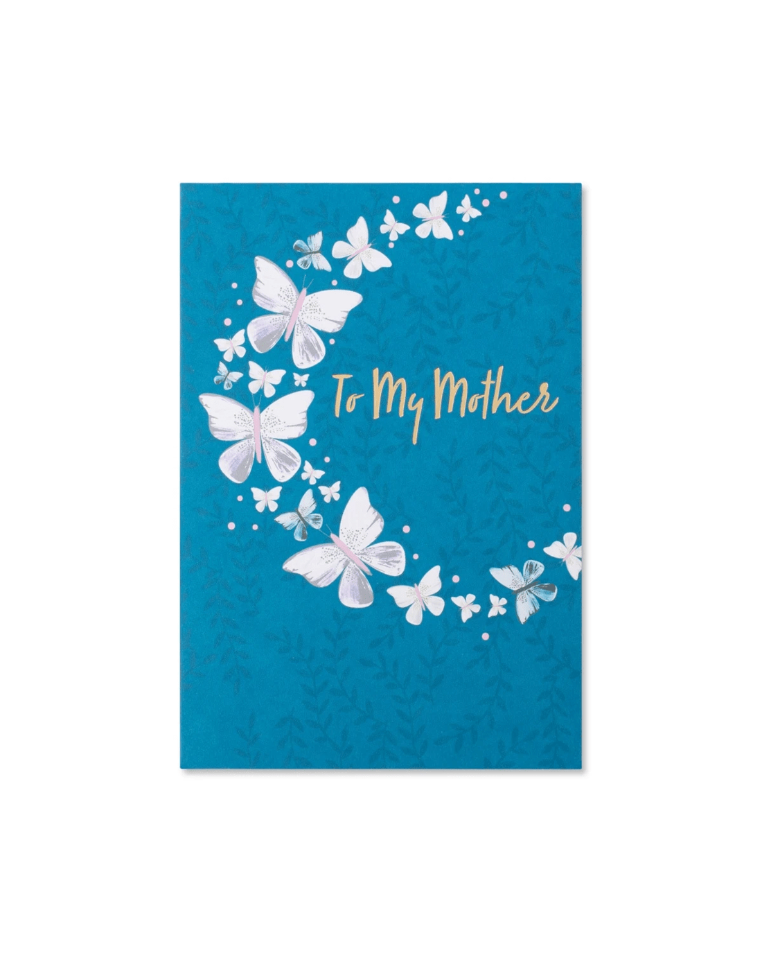 This elegant Hallmark card showcases a delicate butterfly wreath with gold foil lettering, making it a classic Mother's Day tribute.