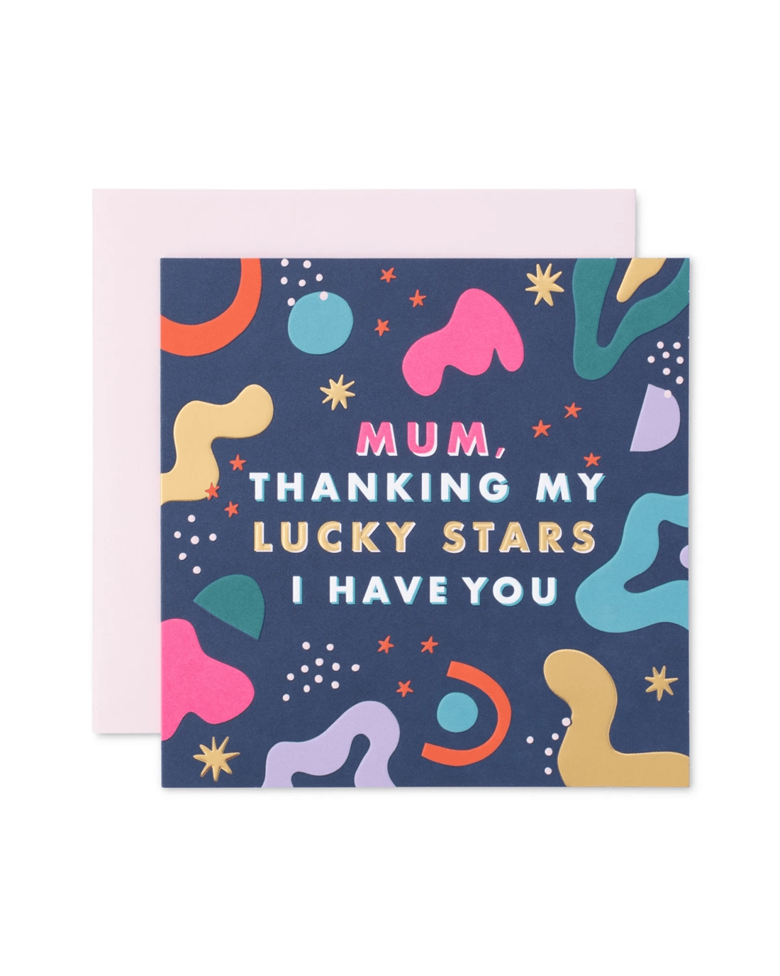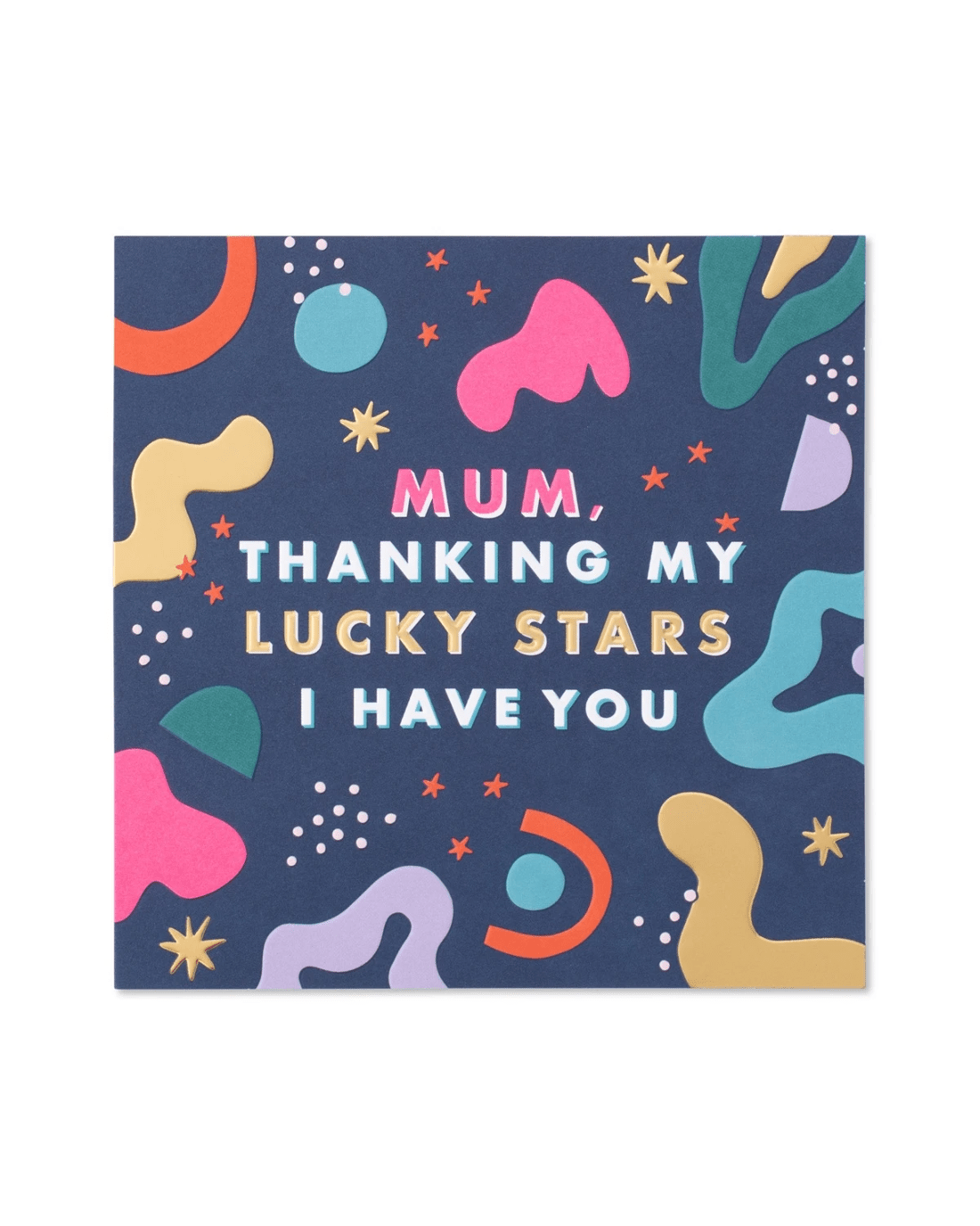 A vibrant Hallmark card featuring an abstract pattern with neon colour, bold typography and gold foil detailing, celebrating mum in a fun and artistic way.