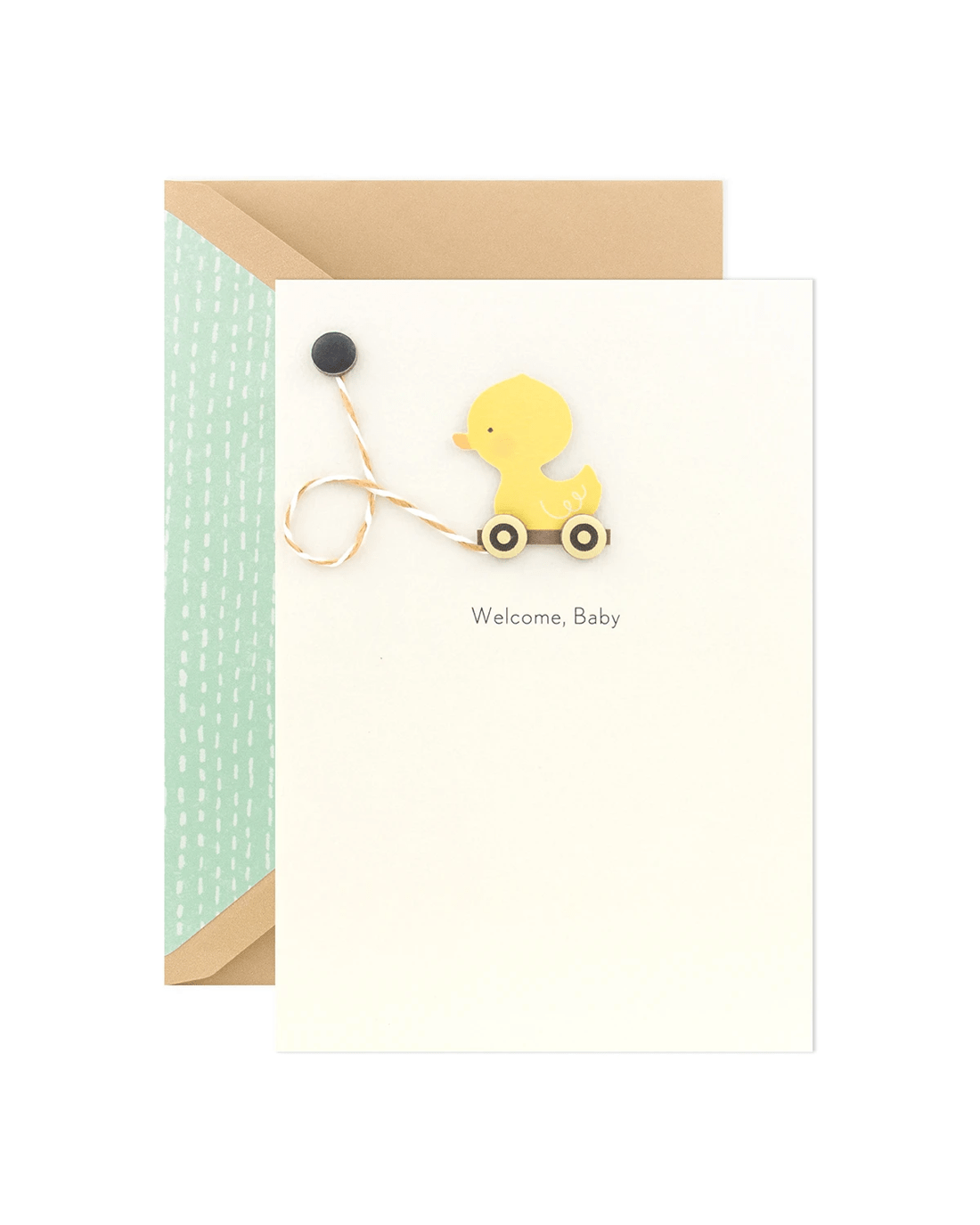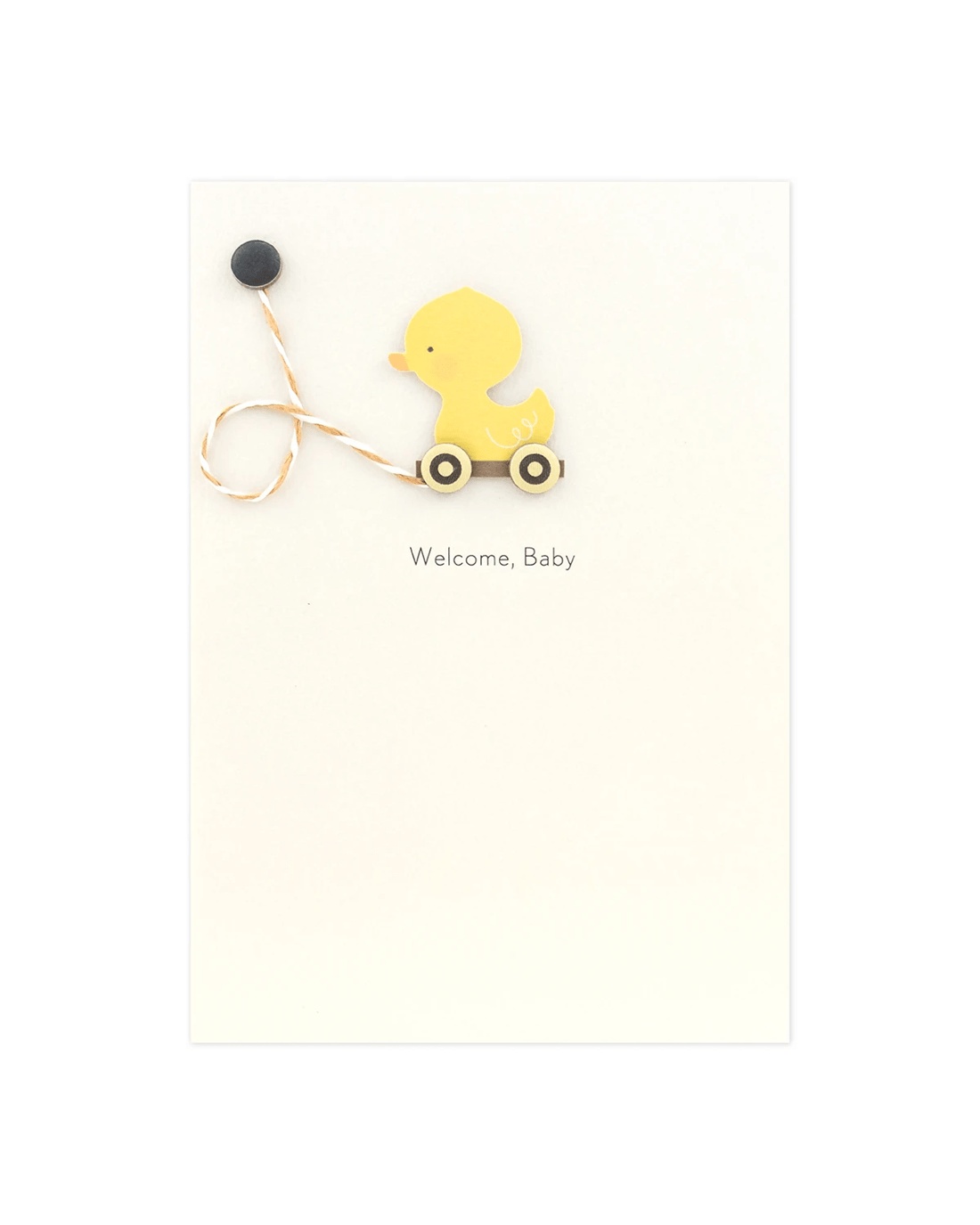 - The front of the card features an illustration of a duck toy, 3D plaque attachments and the message 'Welcome, Baby'