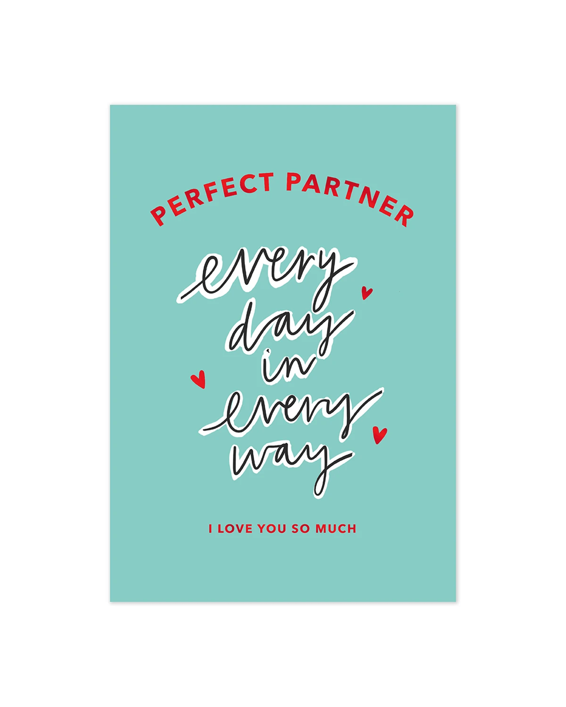 Features- The front of the card features red foil highlights, illustrations of love hearts, and the message 'PERFECT PARTNER every day in every way I LOVE YOU SO MUCH'