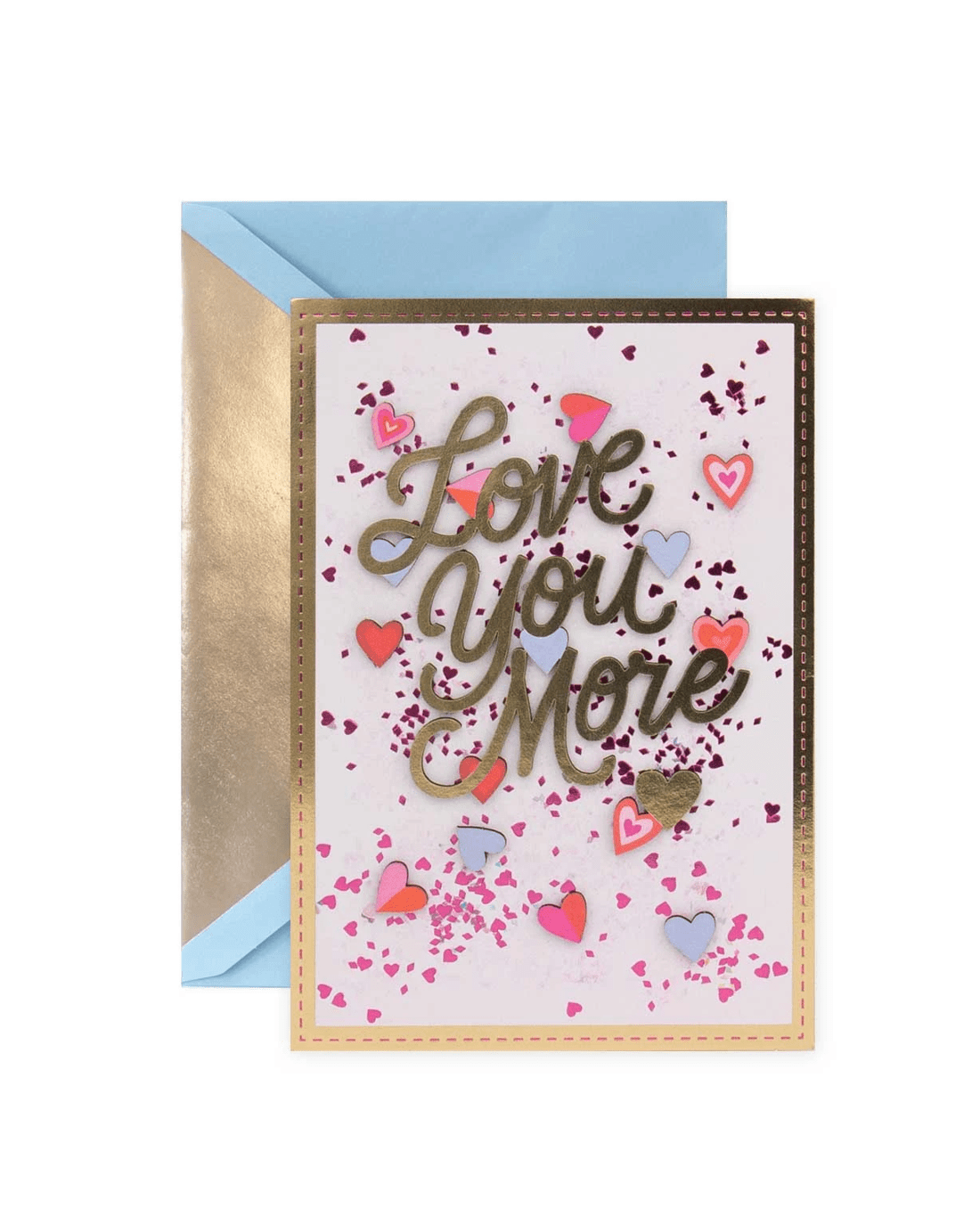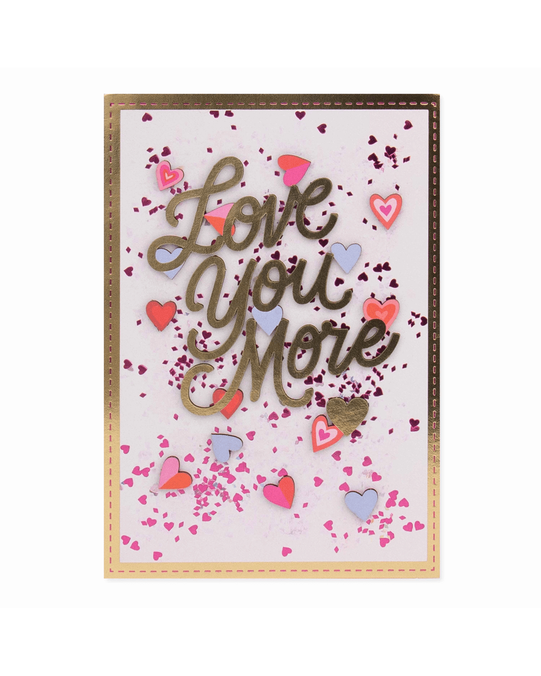 • The front of the card features gold and pink foil highlights, laser cut 3D plaque attachments, illustrations of love hearts and confetti and the message 'Love You More'