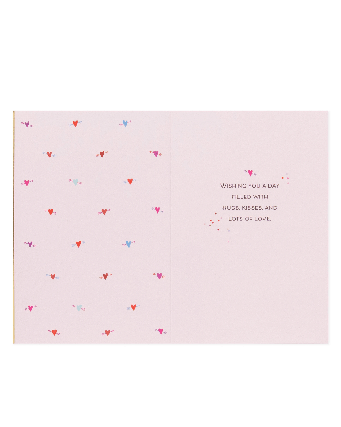 • The inside of the card features illustrations of love hearts and arrows alongside the message 'WISHING YOU A DAY FILLED WITH HUGS, KISSES, AND LOTS OF LOVE.'