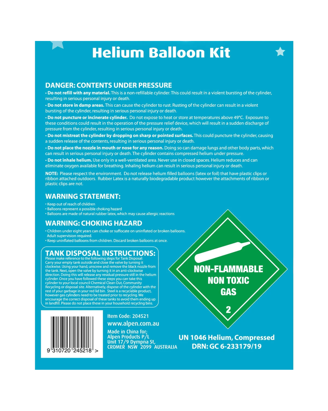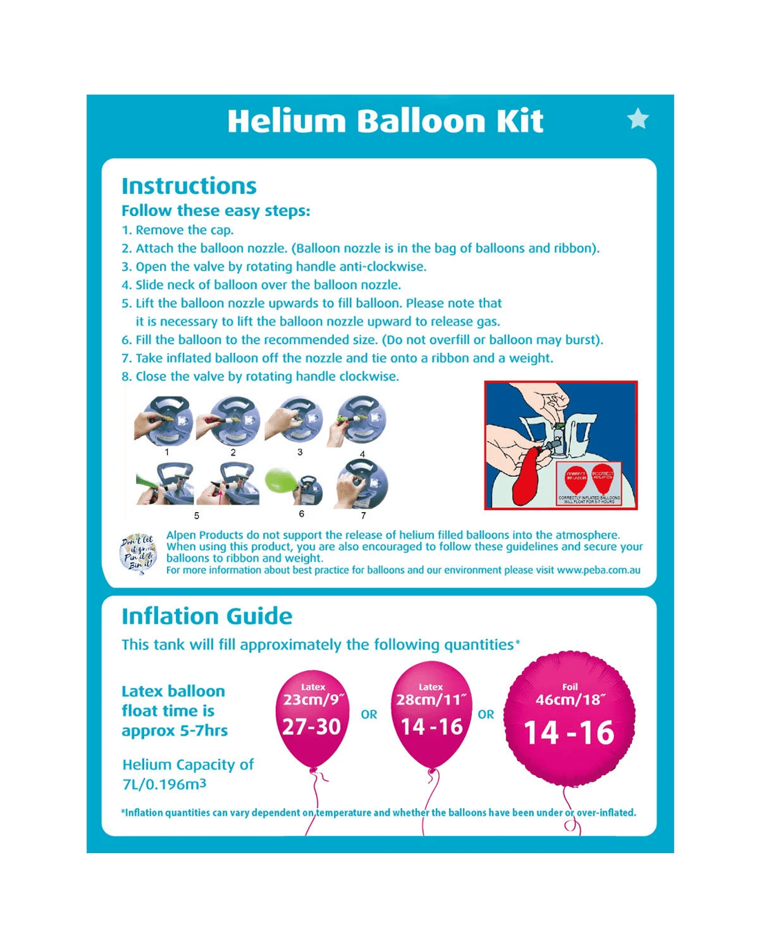A one-stop portable solution for brightening up any party or special event. This balloon kit includes 1 standard helium tank, 30 helium quality latex balloons (9’’/ 23cm) and a 10m spool of white curling ribbon. The tank is lightweight and easy to use - bring to your home, classroom, office, or party venue to quickly inflate latex, mylar or foil balloons.