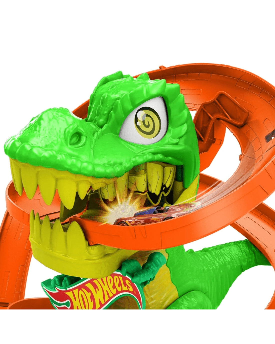 - The playset features a large-scale dinosaur nemesis that has eyes that spin every time cars whizz past until it gets knocked out!