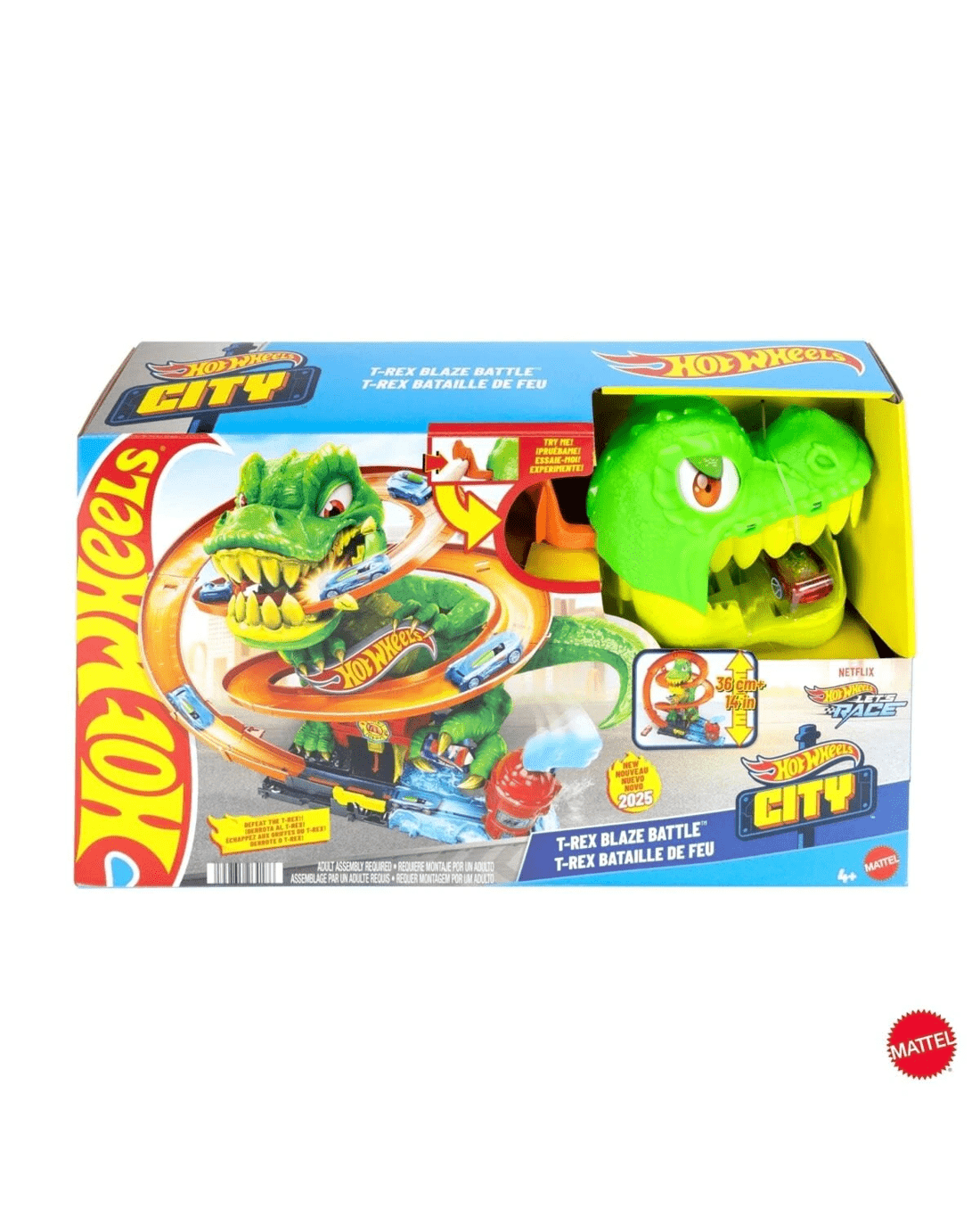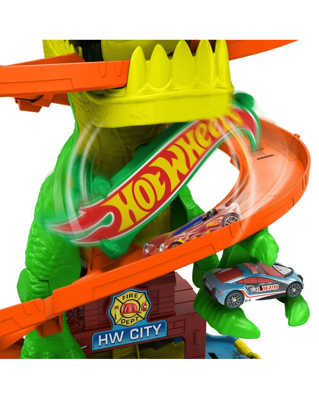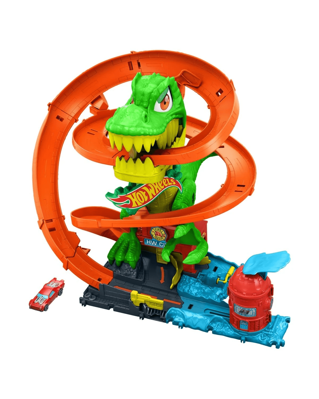- Take on a hungry T-Rex that has attacked the Hot Wheels City fire station with a 1:64 scale toy car!