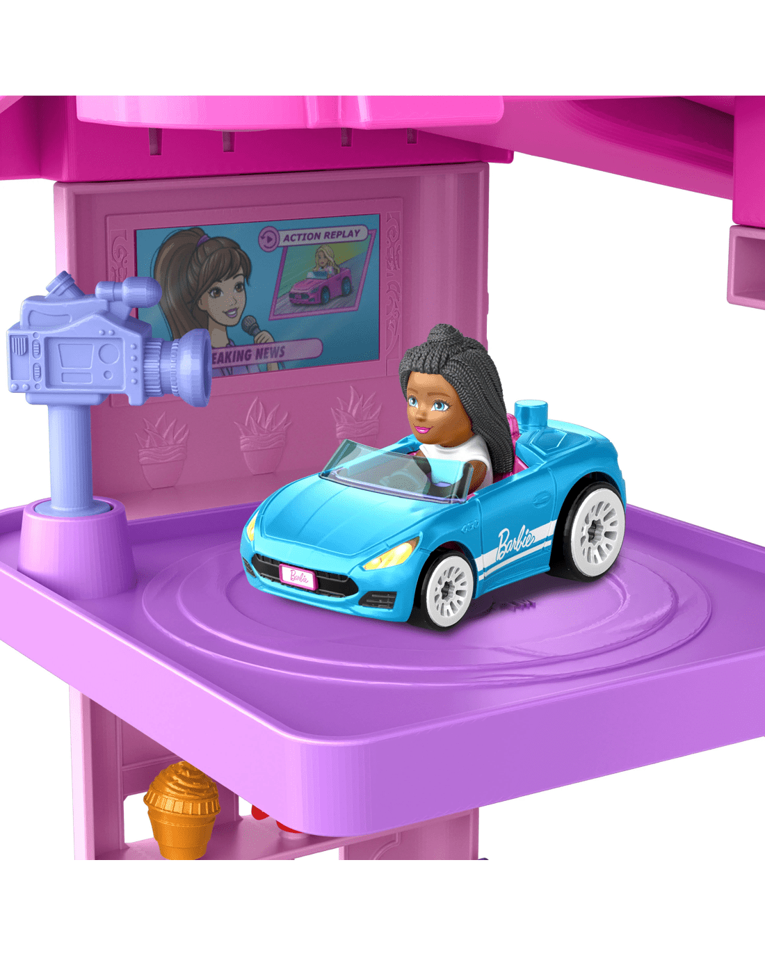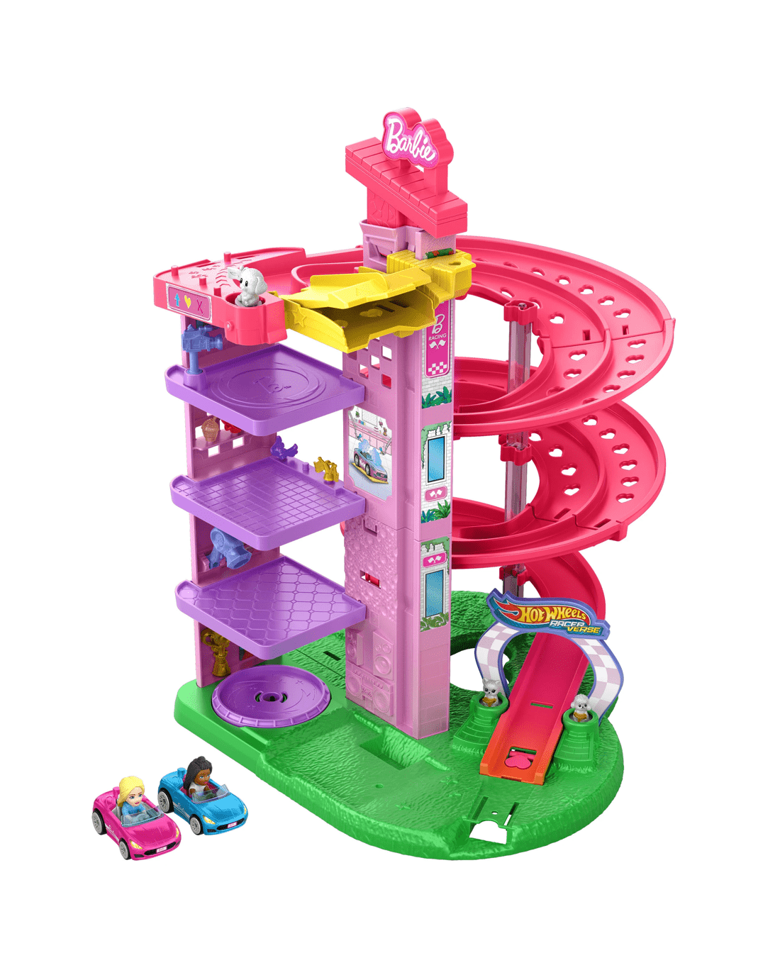 Race Barbie 'Malibu' and Barbie 'Brooklyn' through five levels of super fun adventures with the Hot Wheels RacerVerse Barbie track set. The two adorable die-cast RacerVerse vehicles feature non-removable Barbie 'Malibu' and Barbie 'Brooklyn' figures who can start their adventures in the kid-powered elevator as they head up to the pretend car spa to get race-ready. After that, pop into the tune-up shop to get one of five attachable accessories, then go to the next level for a pre-race interview! Race down the side-by-side signature pink track where the fastest racer is greeted by a pop-up puppy and cat. Celebrate afterwards in the party room together!