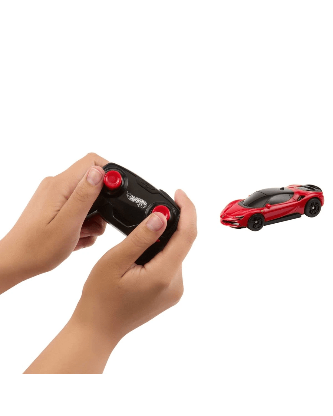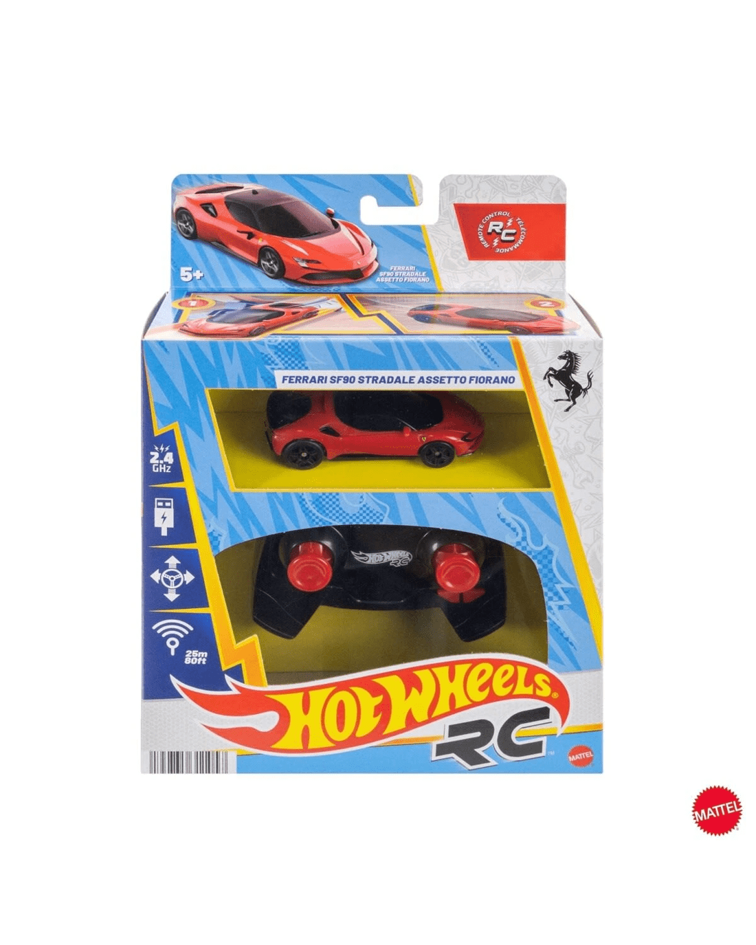 • The Hot Wheels RC 1:64 scale Ferrari SF90 operates on a 2.4 GHz frequency to prevent interference when racing other remote-control cars