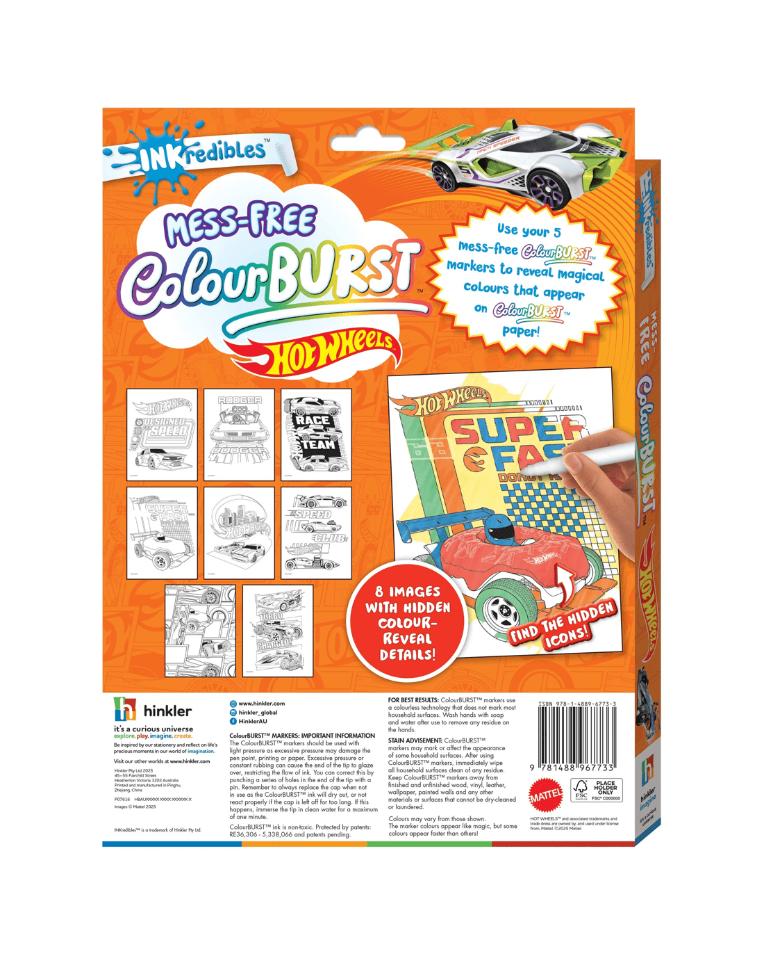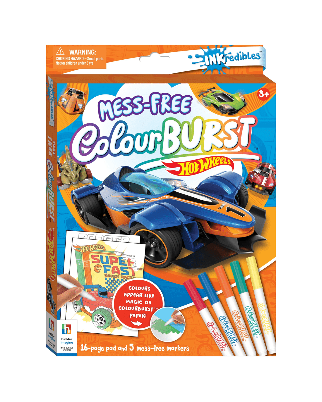 Get ready for a turbocharged colouring adventure with the INKredibles ColourBurst Hot Wheels! With 16 pages of awesome Hot Wheels cars, tracks and stunts, this book is packed with thrilling activities that come to life with every swipe of your ColourBurst marker! Plus the mess-free technology means colours stay on the page and off everything else!