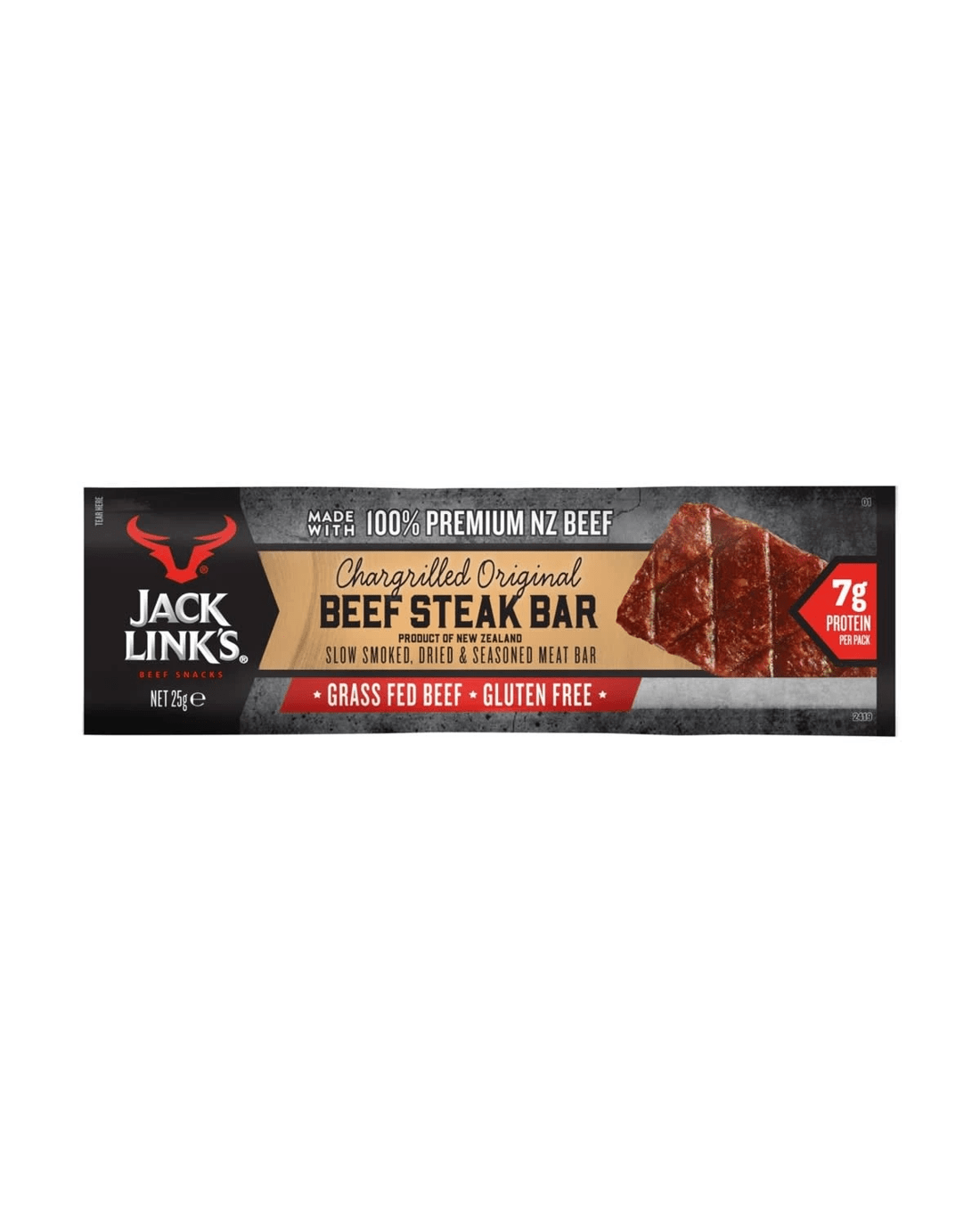 Step aside chalky protein bars. Move over sugary muesli bars! With Jack Link's Chargrilled Original Beef Steak Bars you get a bar made with 100% beef, savoury taste and 7 grams of protein per bar. Come on! That's a real snack.