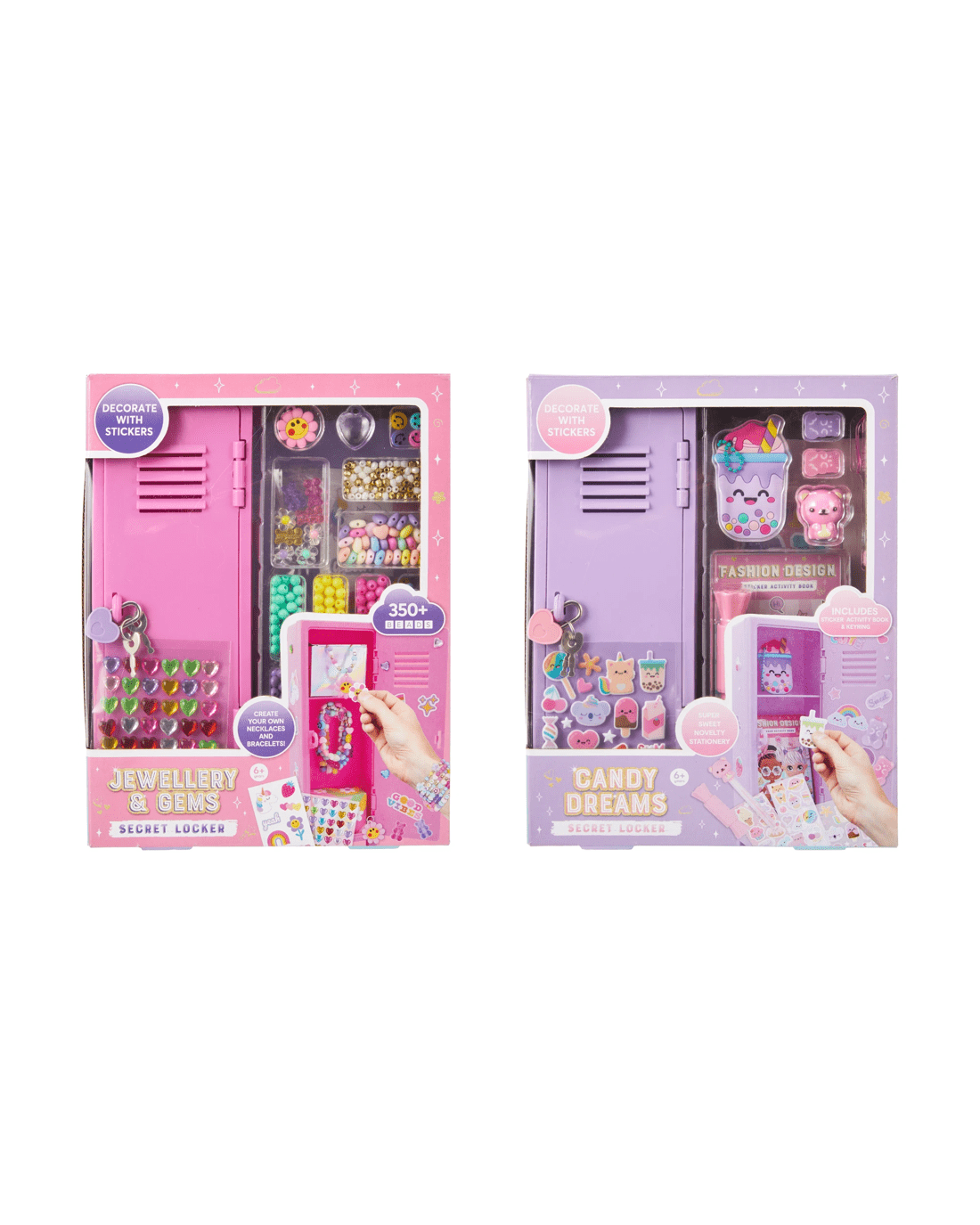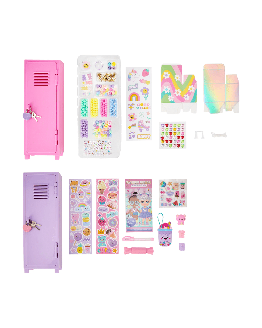- Includes 1 x storage locker, 1 x lock and key, 1 x gem sticker sheet, assorted beads and charms, 2 x DIY colour boxes, 1 x sticker sheet, 1 x plastic hook, 1 x elastic string and 1 x adhesive dot