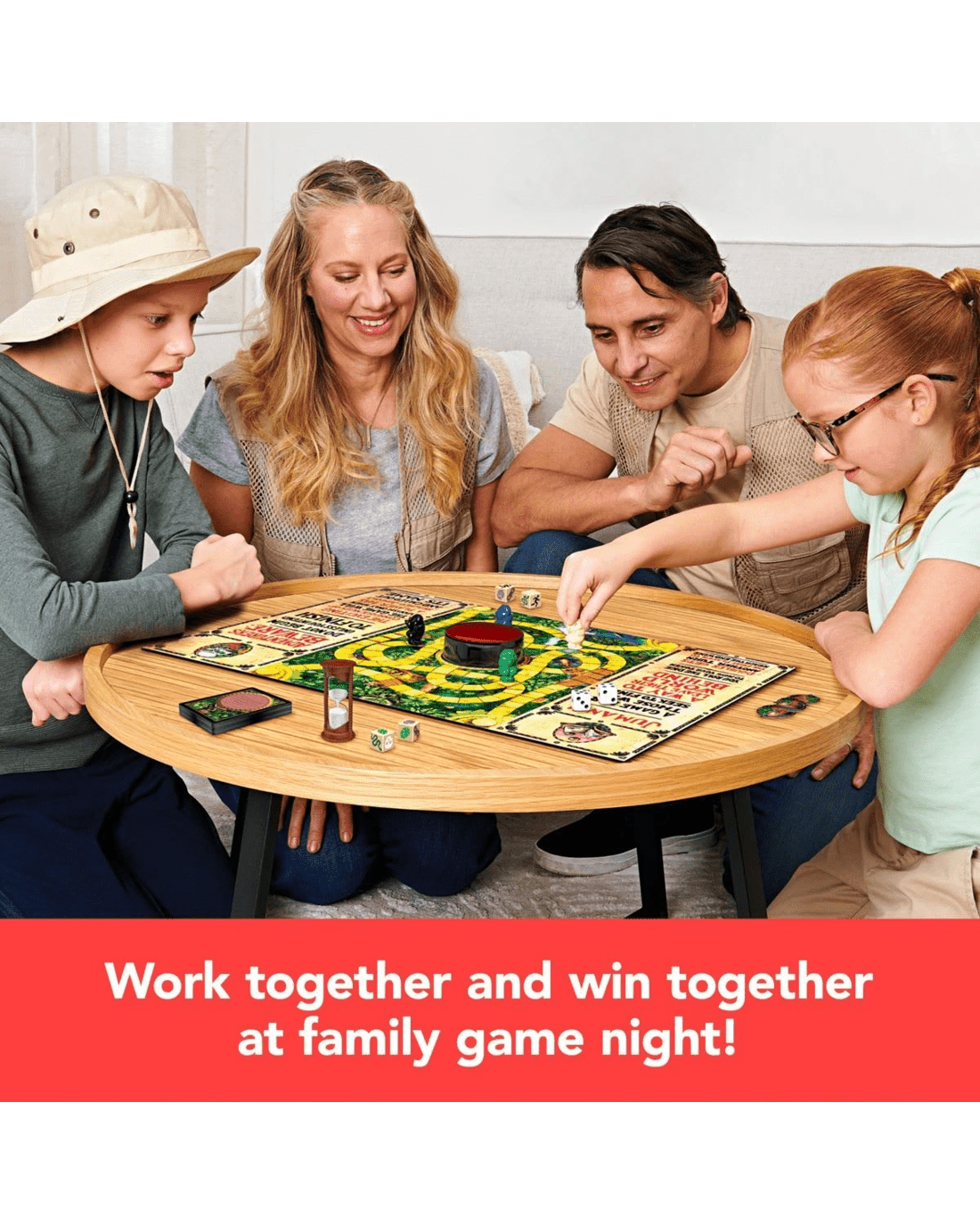 • Work together, win together: Each player races to be the first to reach the center of the jungle and yell “JUMANJI!” to win. But if ANY player loses all their Life Tokens, ALL players lose!