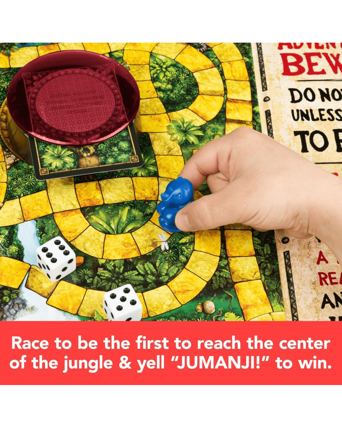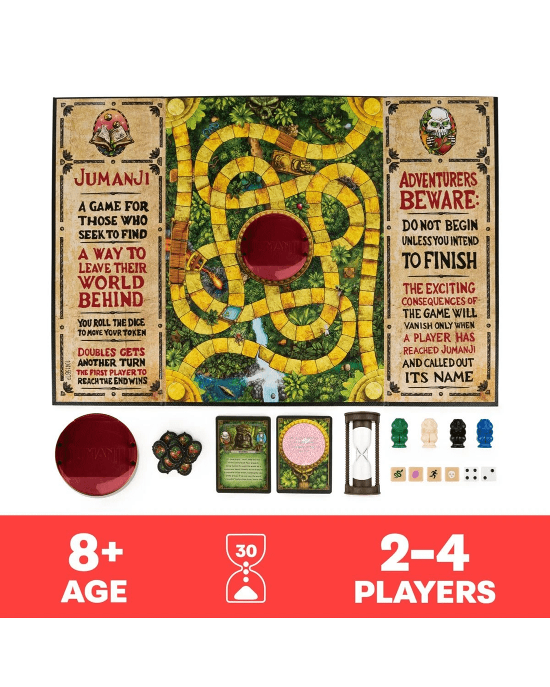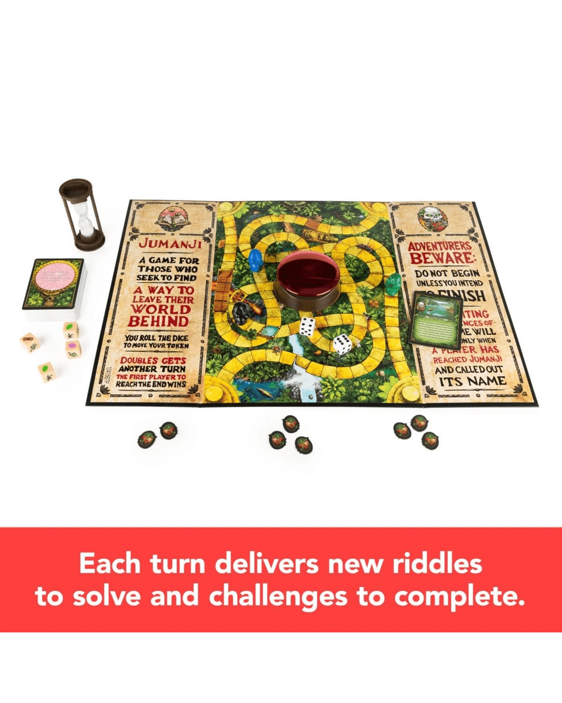 • Do not begin unless you intend to finish!: Jumanji The Board Game takes you and your fellow adventurers on a quest through the jungle, solving riddles and completing challenges while trying not to lose your Life Tokens