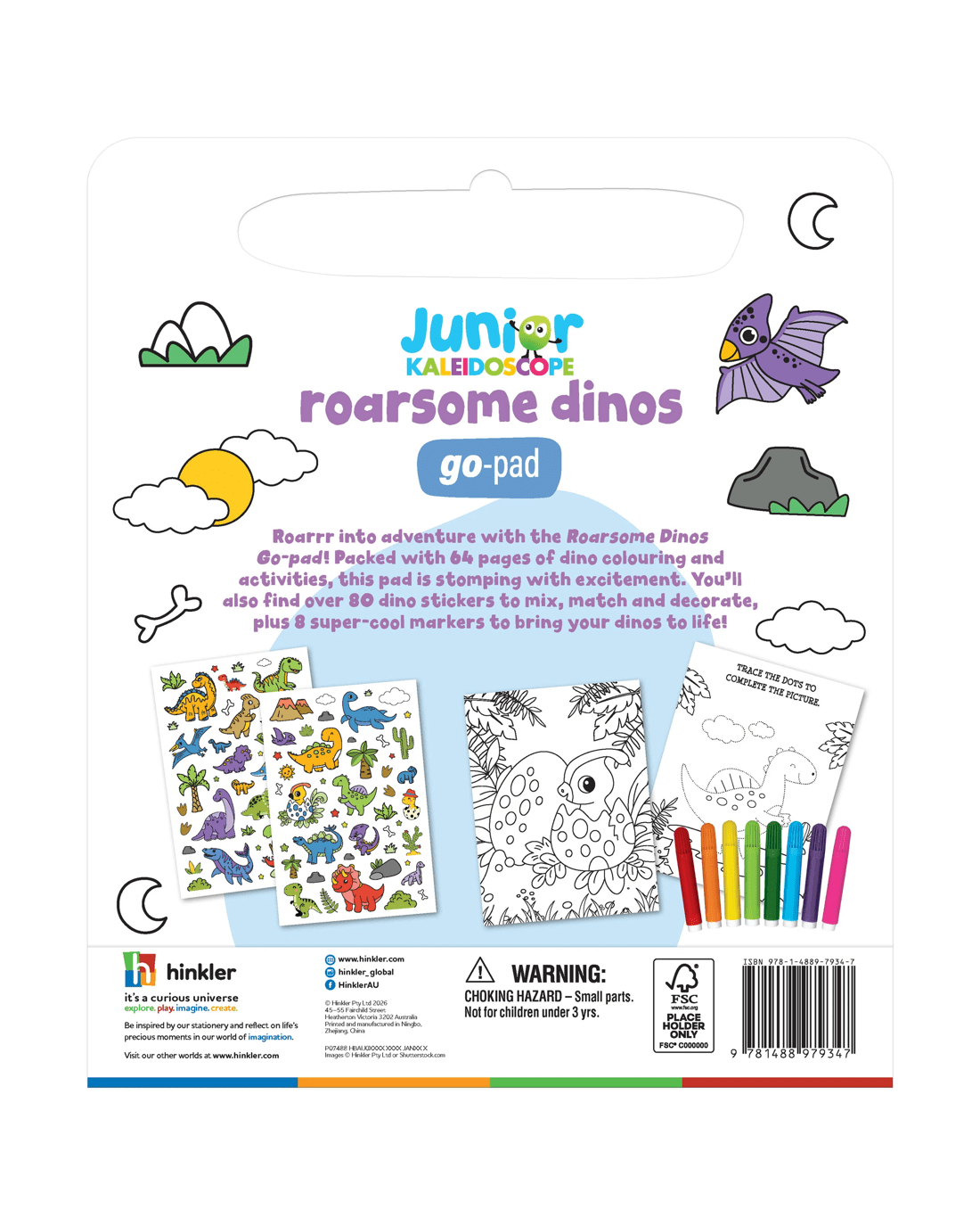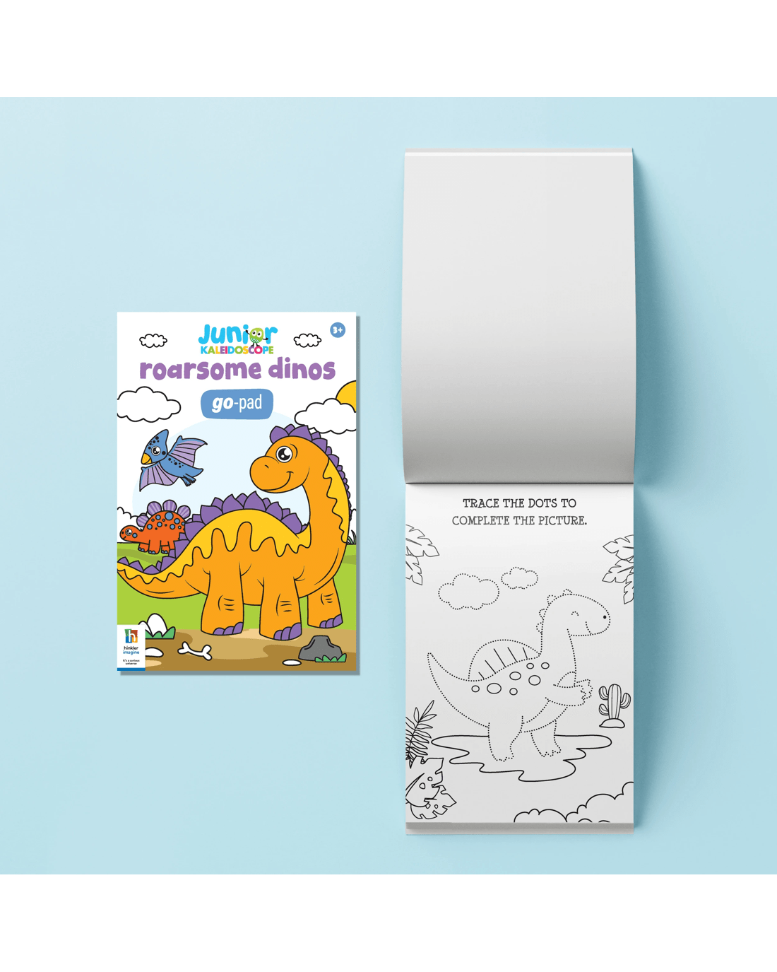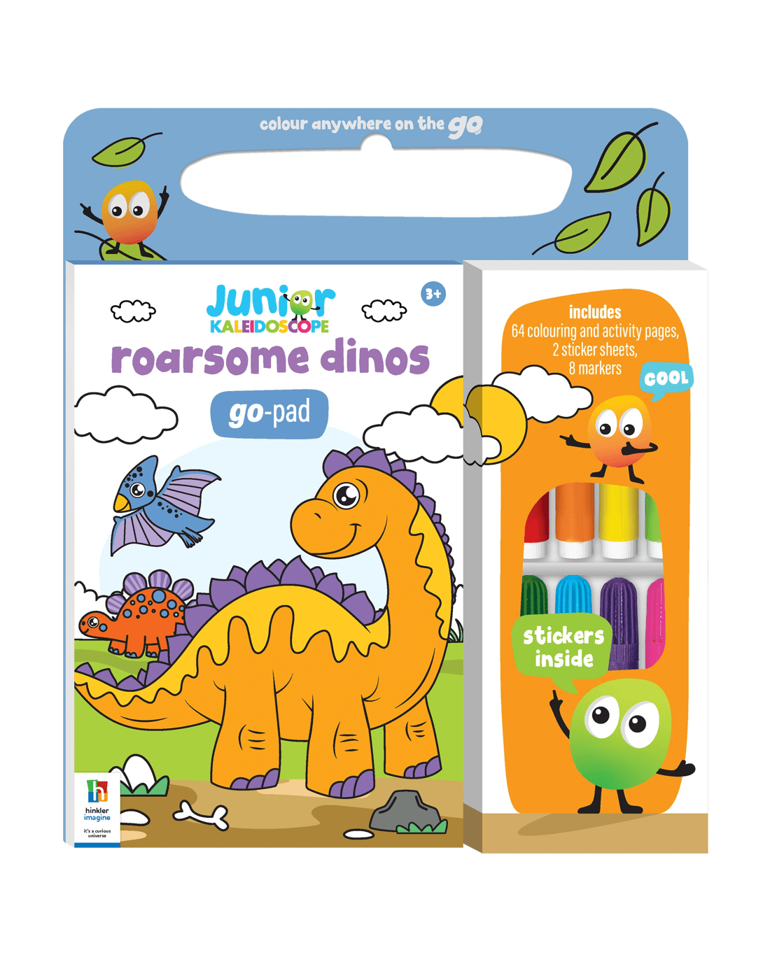 Roarsome Dinosaurs Go-Pad is packed with creative fun! It includes a 128-page colouring and activity pad featuring over 60 pages of delightful colouring and activities, two sticker sheets and eight vibrant markers. Designed with a handy carry handle, it's perfect for keeping little ones entertained at home or on the go.