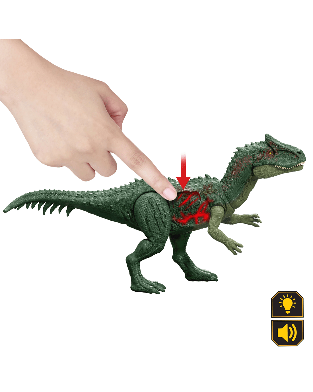 - Lights and sounds! Press the 'damage' area to activate the special light-up effects on this dinosaur. Keep pressing for three levels of intensifying damage!