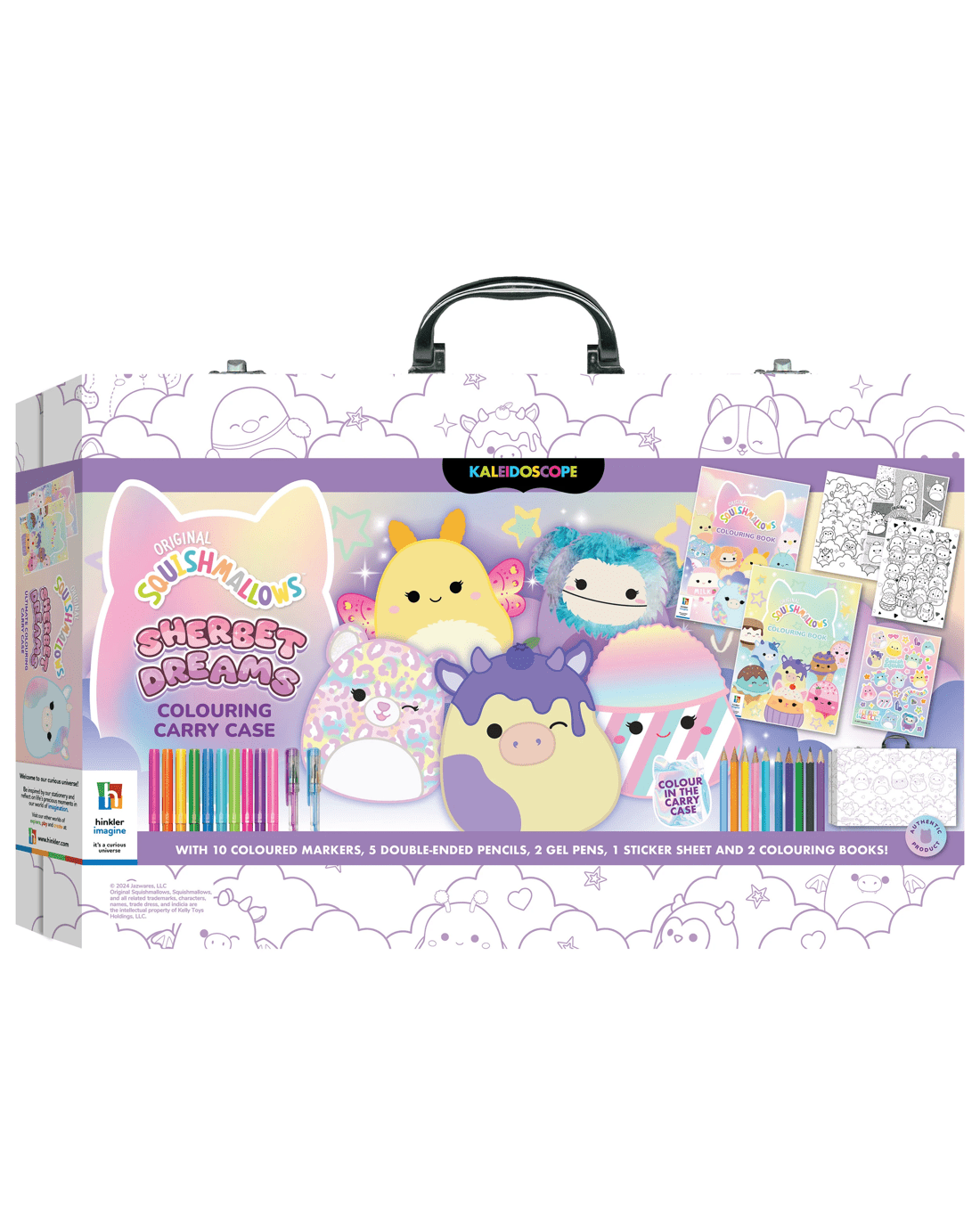 Step into a ‘Mallow world of endless creativity with the Kaleidoscope Squishmallows Colouring Carry Case! Get ready to brighten up your day with this amazing colour-in carry case featuring your favourite Squishmallows. Inside, you'll discover two dazzling colouring books filled with Squish-inspired designs that are just waiting for your artistic touch. Plus five double-ended pencils, ten markers, two gel pens and a sticker sheet!