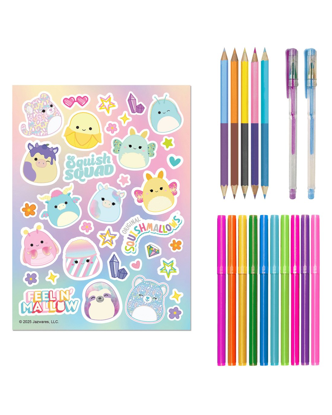 - With 10 x coloured markers, 5 x double-ended pencils, 2 x gel pens, 1 x sticker sheet and 2 x 32-page colouring books!
