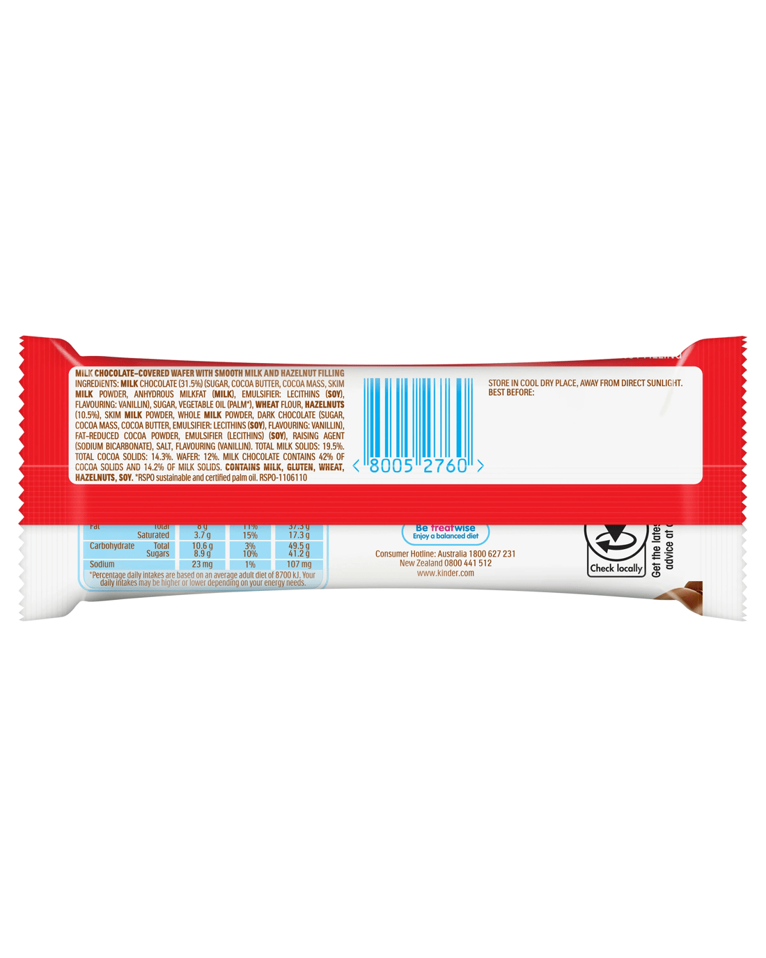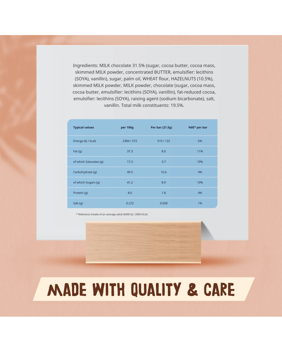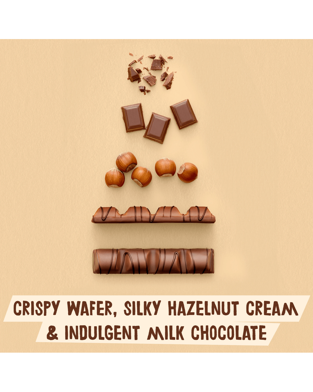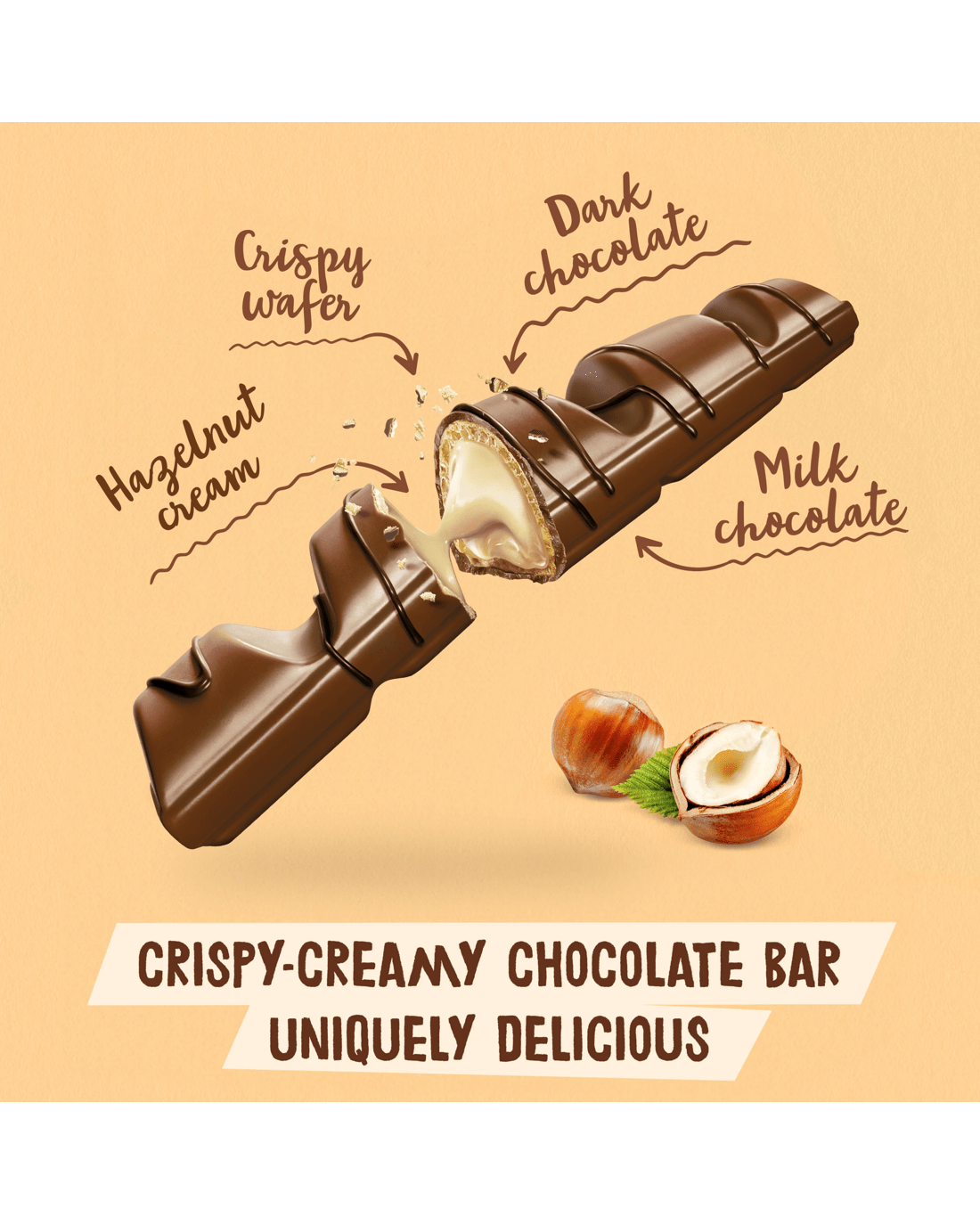 - Allergen information: Contains milk, gluten, hazelnuts and soy