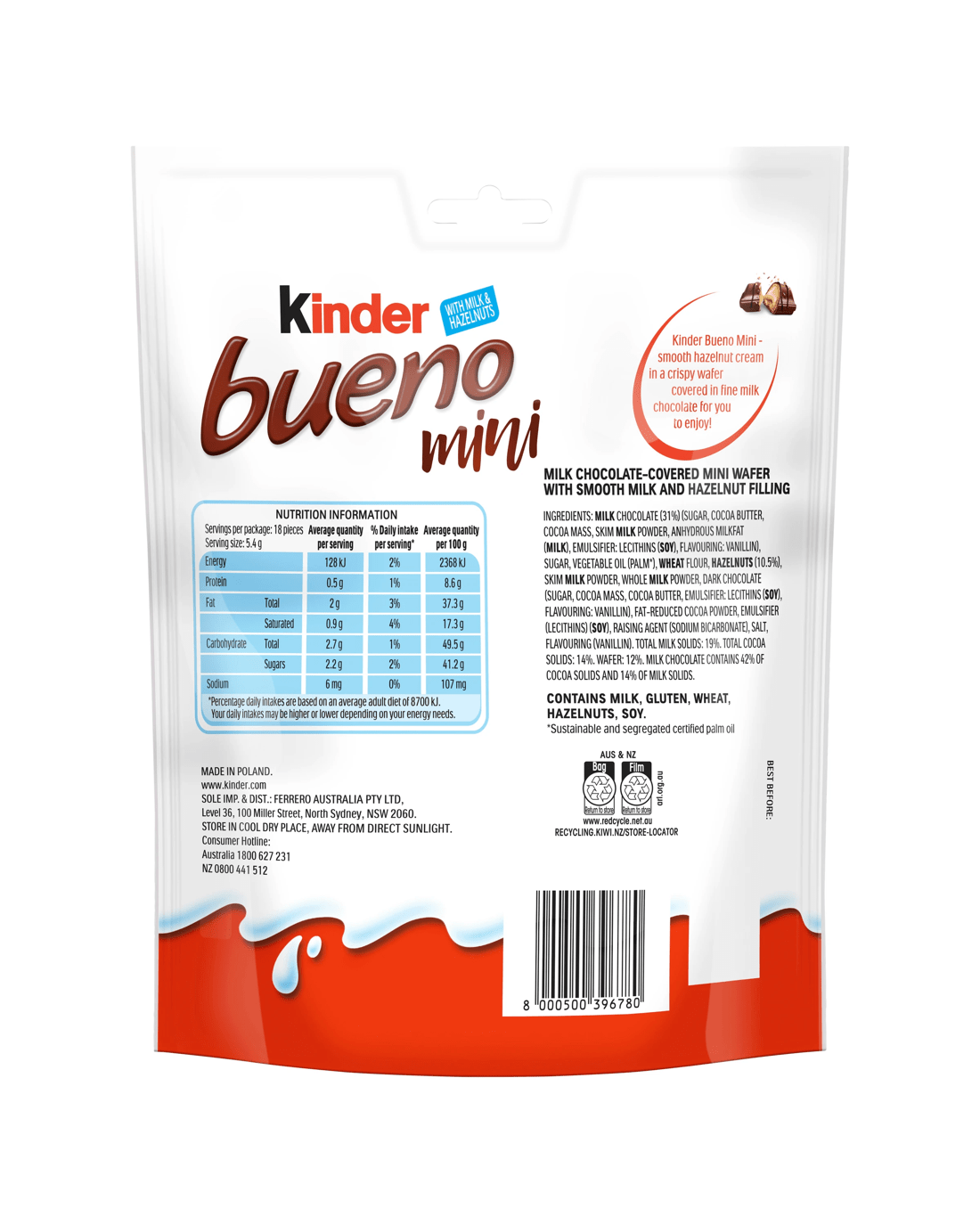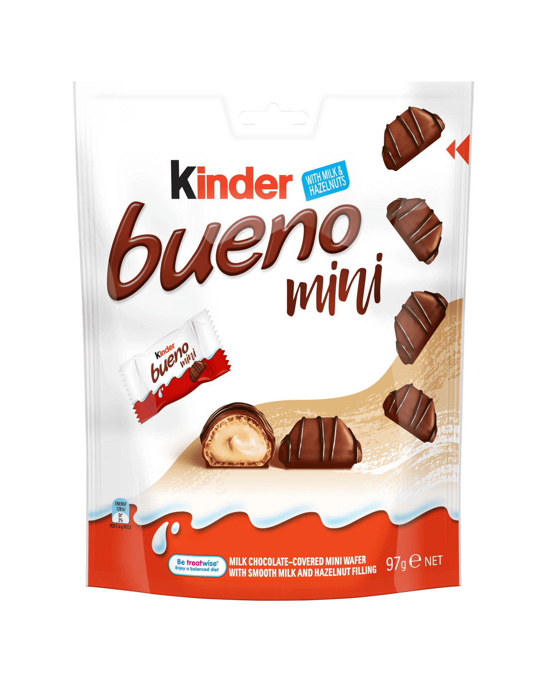 - Kinder Bueno Mini - smooth hazelnut cream in a crispy wafer covered in fine milk chocolate for you to enjoy!