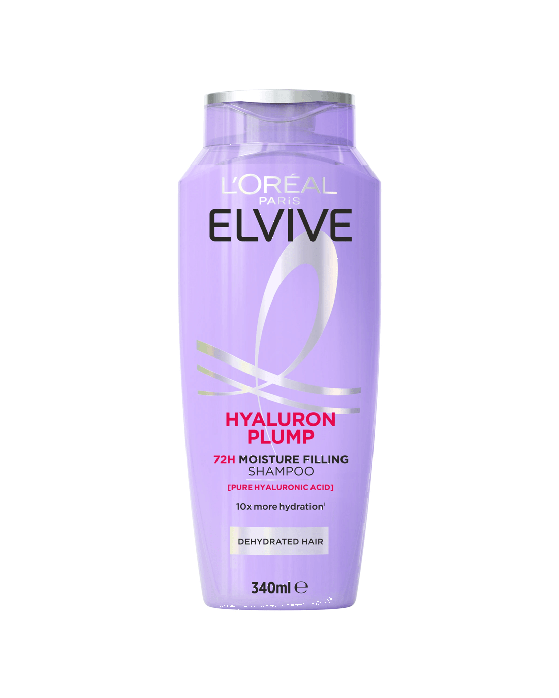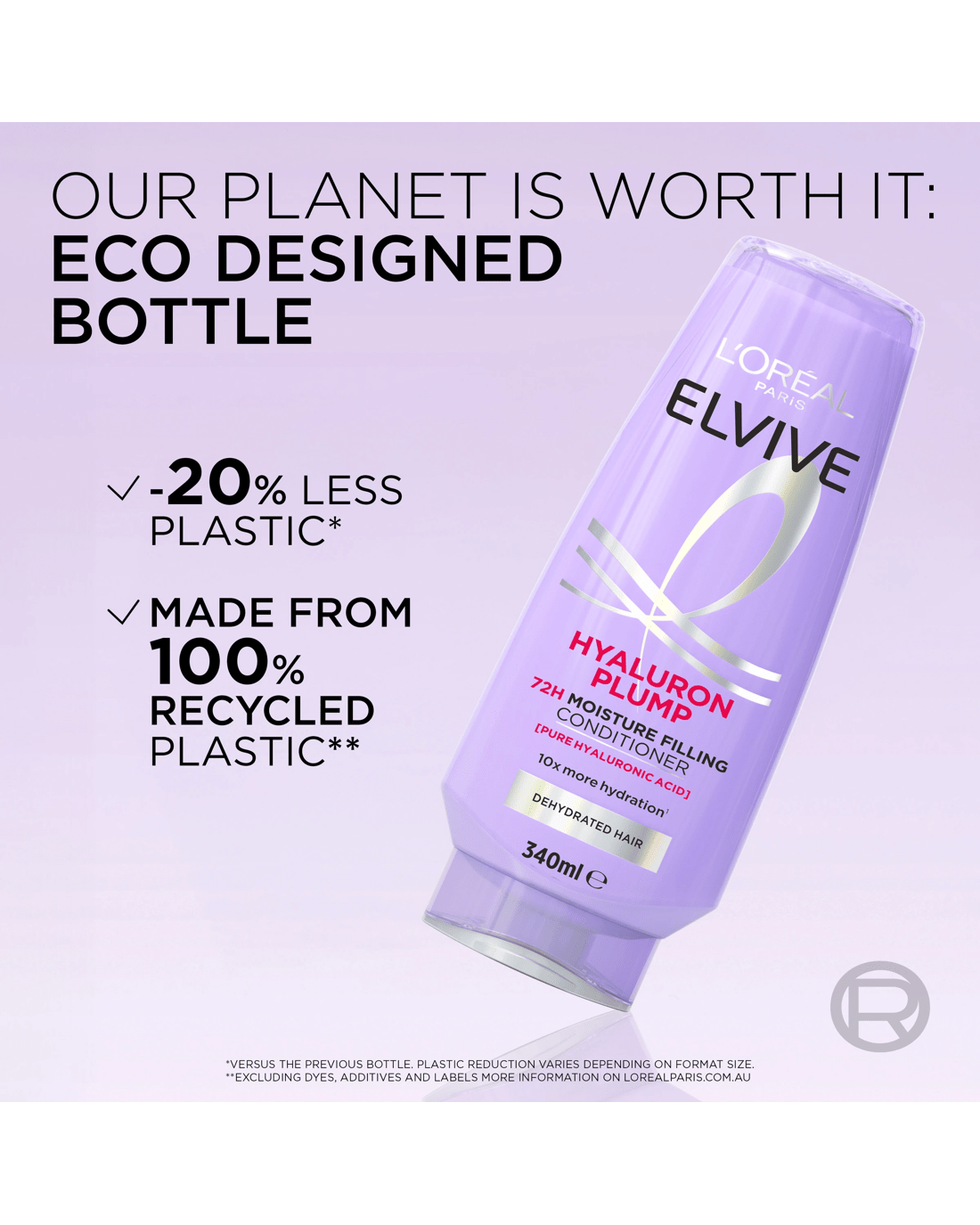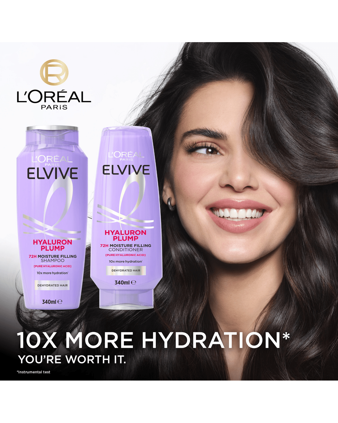 Hyaluronic acid, now in our haircare. Discover Elvive Hyaluron Plump, a skincare-inspired range scientifically designed for dehydrated hair. Infused with hyaluronic acid, the formulas plump the hair with 72H of moisture*, for shinier, 10x more hydrated* and revitalised hair with no weigh down. The power of [hyaluronic acid] naturally found in the body, this molecule retains 1000x its weight in water to help re-plump hair. Because our planet is worth it, this bottle uses up to 20% less plastic** and is made of 100% recycled plastic***.