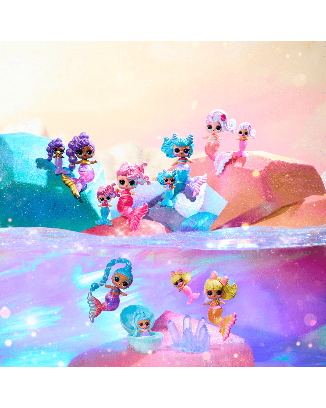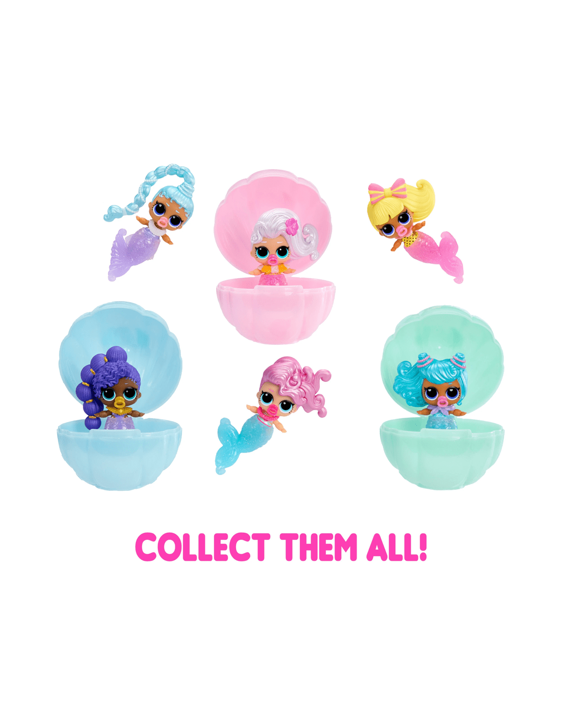 Meet all six adorable Baby Sisters in this shimmering sea collection - lil Splash queen, lil Coral Dream, lil Laguna Luxe, lil Island BB, lil Sun Kissed QT, lil SPF cutie - each featuring flowy new mermaid hair, vibrant tails and splashy personalities. Will you discover the ultra-rare mermaid?