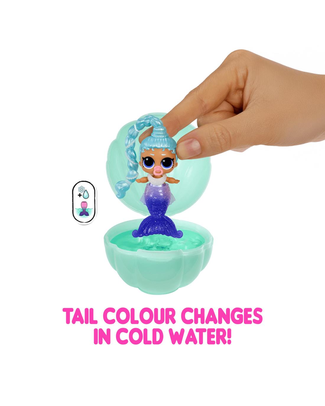 Each Baby Sister doll comes with a removable fin that can transform into an adorable mini mermaid! Fill ice water into her clamshell. Then, dip the tail in the water to reveal a dazzling colour-change surprise right before your eyes - watch the scales change colour as the water brings the magic to life!