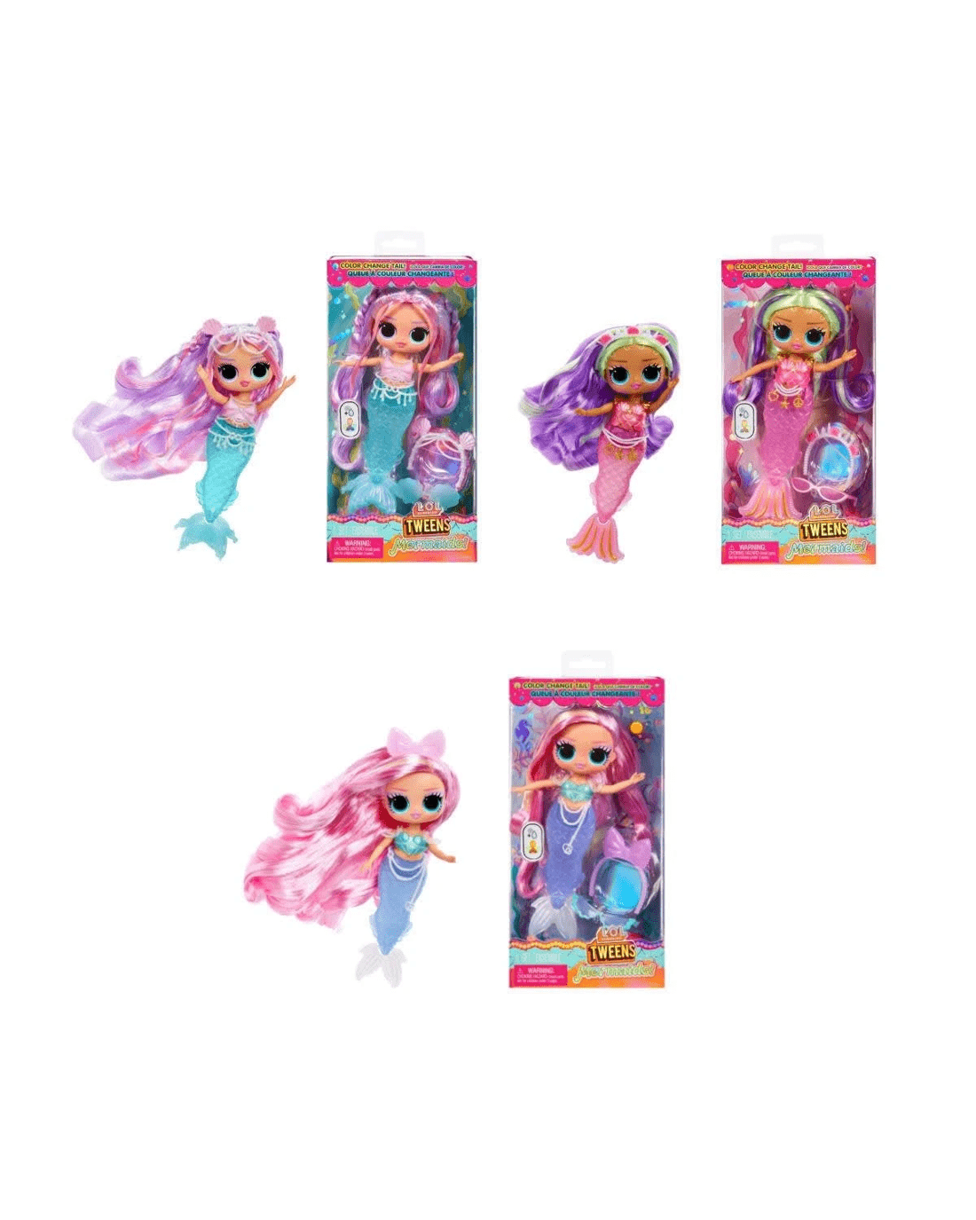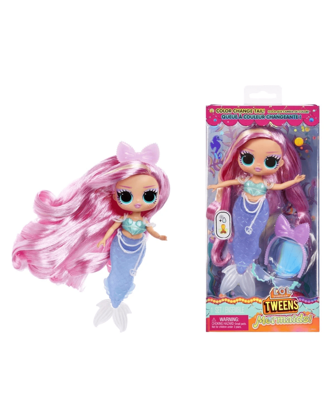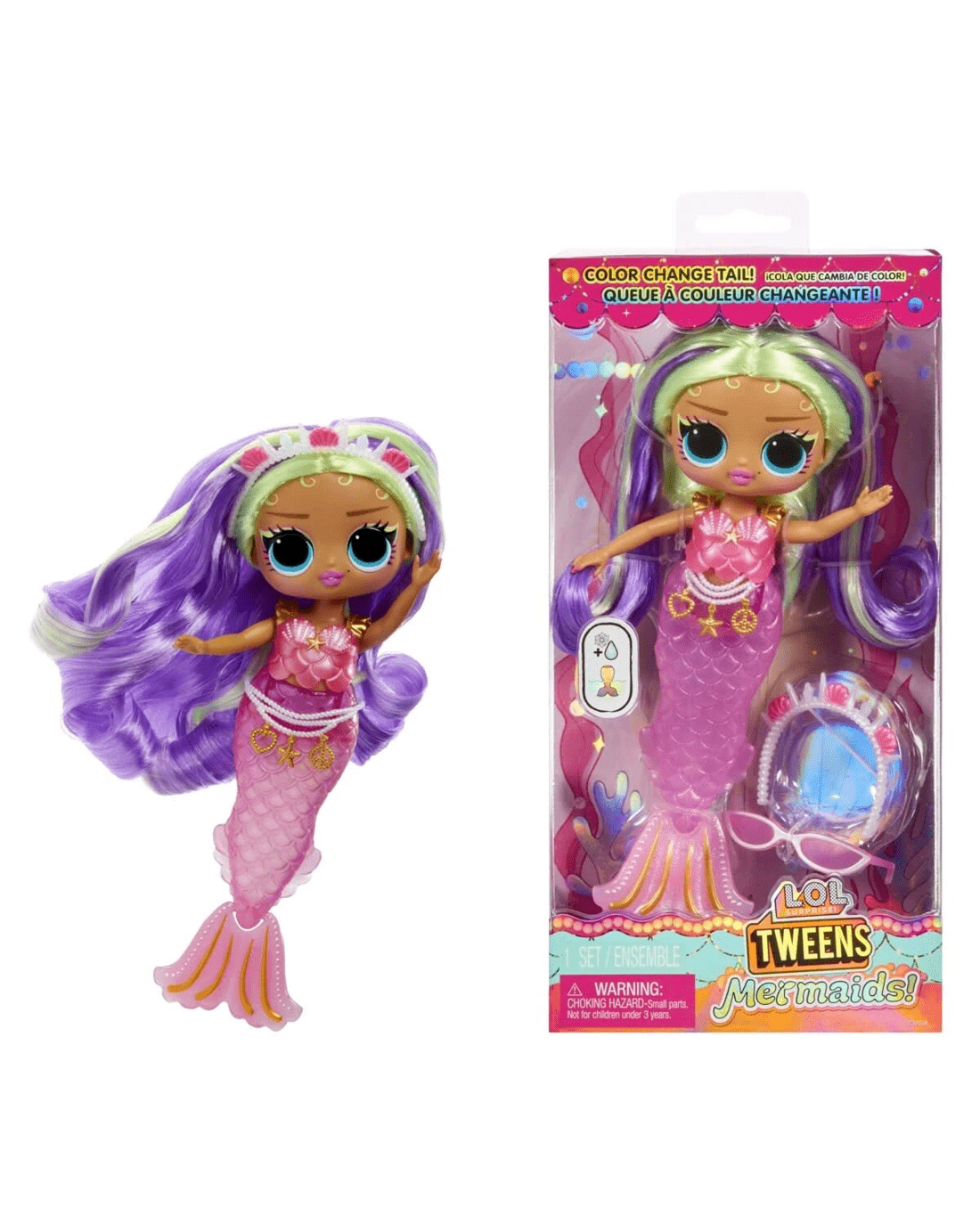 Get ready to dive into an enchanting world of magical mermaid fun with the all-new L.O.L. Surprise! Tweens Mermaid fashion doll with dazzling accessories to unbox! Perfect for bath time and imaginative play, brings a splash of excitement with her beautiful colour-changing tail and mesmerising fin that can move back and forth! Dip your Tweens Mermaid doll into cold water and watch as her tail transforms colours, creating a magical underwater experience! Can you guess why her fin changes colours too? Don't forget to style your doll with her charming accessories including her sea shades, sea shell tiara and cute pearl belt! She has stunning features, gorgeous hair and her own fashionable mermaid look and comes articulated for tons of posing opportunities, including sitting as she bends at her waist! She can even stand on her fin, making styling your doll even easier with greater stability! Discover what's inside each box including a fabulous L.O.L. Surprise! Tweens Mermaid doll, glasses, a headband and a belt to complement the doll's tail! Collect all three glamorous L.O.L. Surprise Tweens Mermaid fashion dolls: Cleo Clove, Lola Waves and Lana Marine for a complete set of endless mermaid fun!