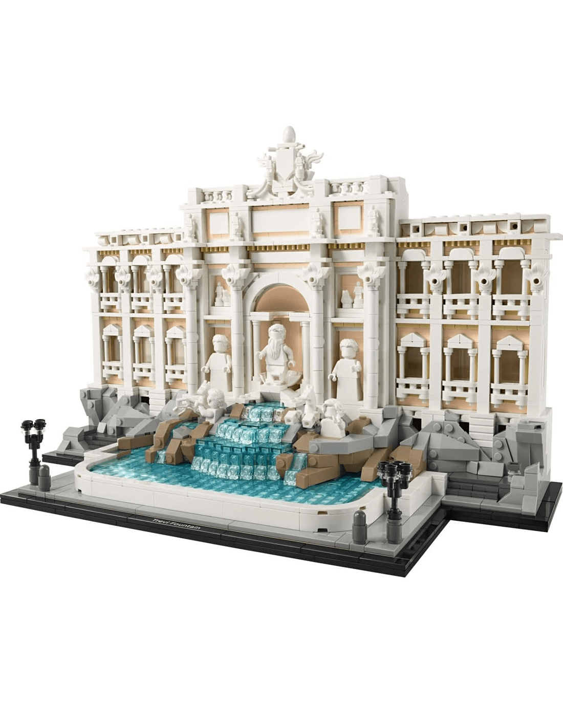 Experience updated building techniques while creating authentic details like the facade of the Palazzo Poli and iconic statues of Oceanus in his shell chariot and Abundance and Health in minifigure form. There's also hippocampi and Tritons in the water, the small 'Lovers' Fountain' off to the side and a nameplate to complete a spectacular desk display model of the Trevi Fountain.
