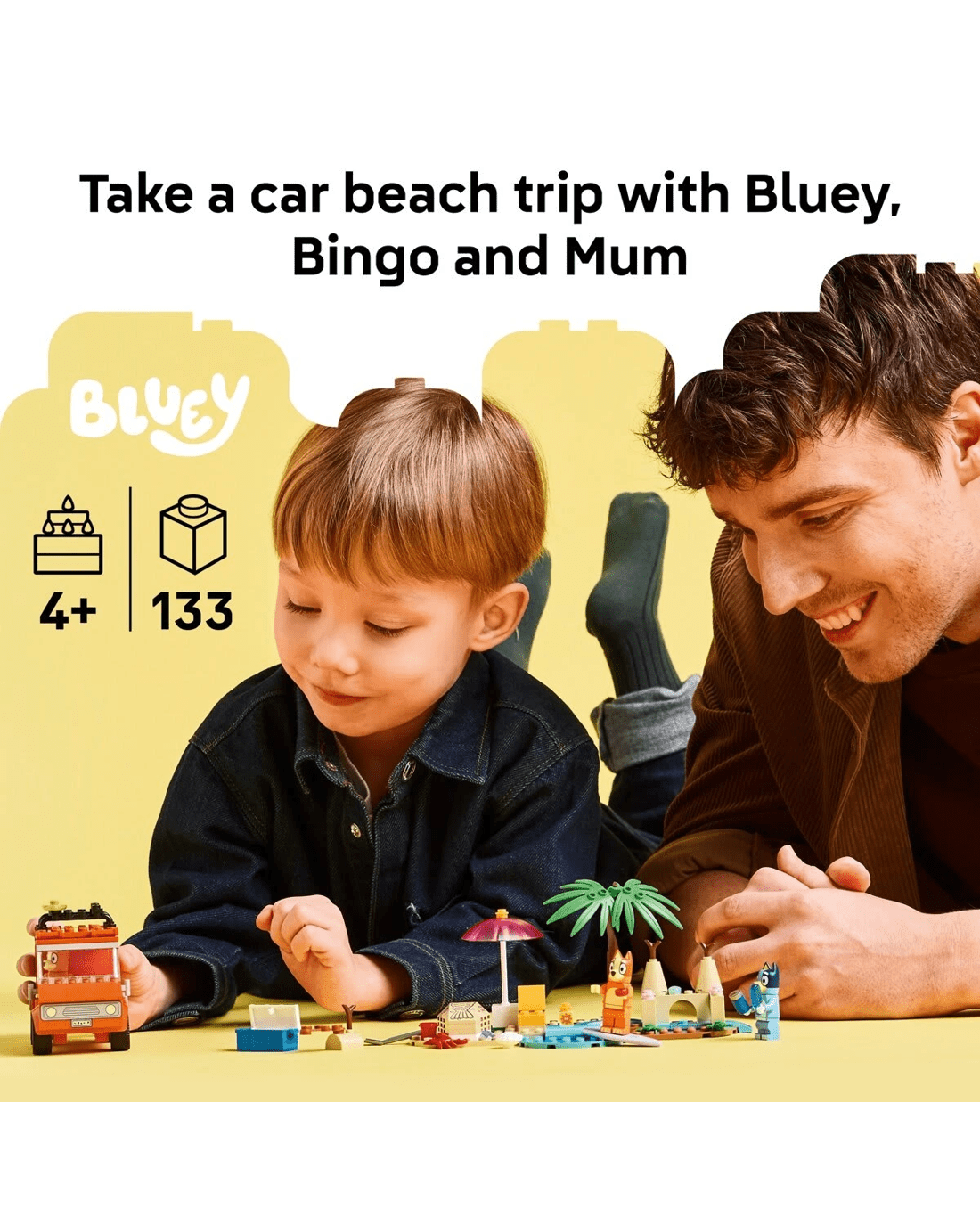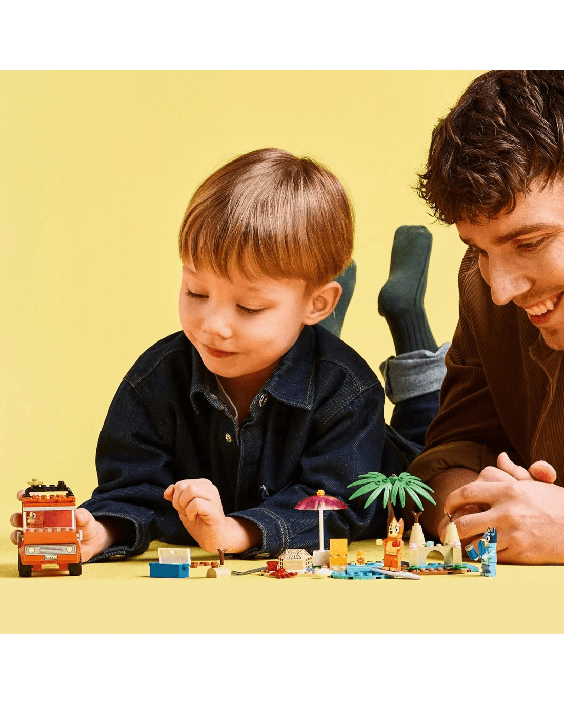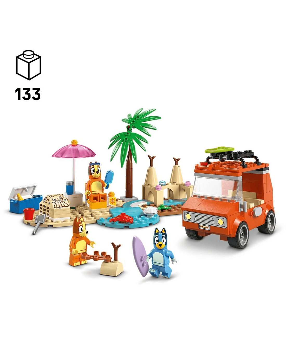 - Interactive building toy for kids - This fun-packed playset features LEGO minifigures, a toy vehicle and lots of hands-on activities for a fun day at the beach with Bluey, Bingo and Mum