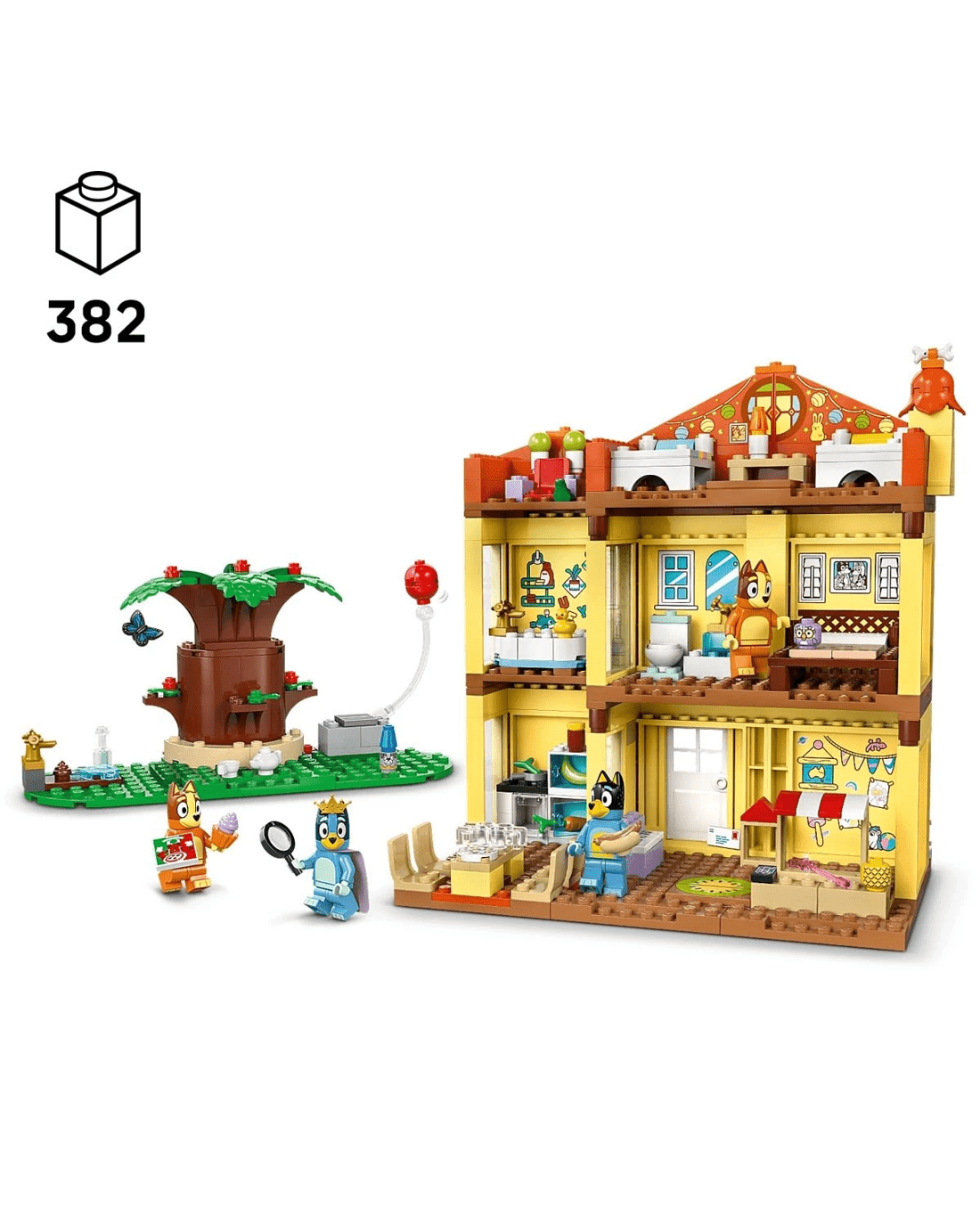 The multi-room, modular playhouse comes with four minifigures - Bluey, Bingo, Chilli (Bluey's mum) and Bandit (Bluey's dad) - plus accessories, including a rainbow cape, wand and magnifying glasses. All rooms are detachable, allowing many ways to play. Inside the playroom is a doll's house, piano and pretend-play food stall. The kitchen has a fridge, oven, hob, table and chairs. Upstairs is Mum and Dad's bedroom and a bathroom. Bluey and Bingo's attic bedroom has a rug, lamp and the Chattermax figure. Next door is the Queen's throne, complete with teapot, cup and frog. In the garden is a large tree, a hot dog, pizza, water tap, Jeremy the gnome and a balloon to knock up into the air.