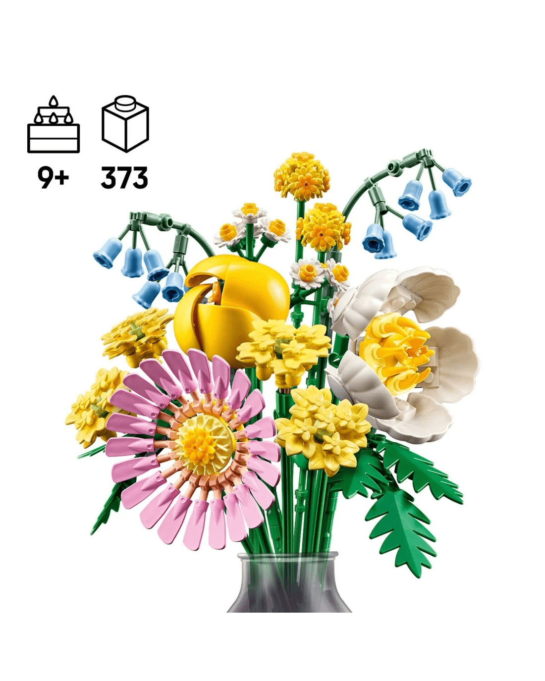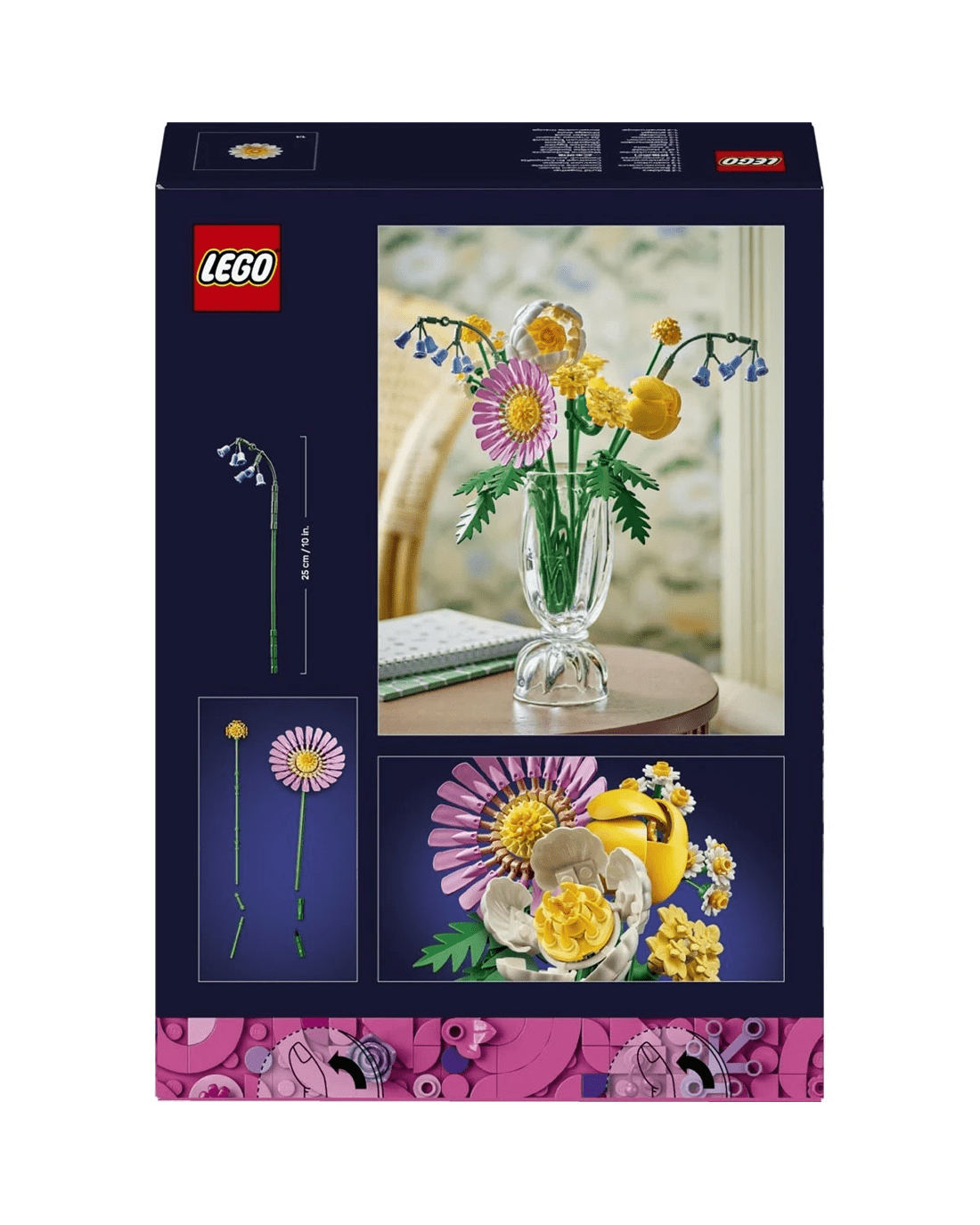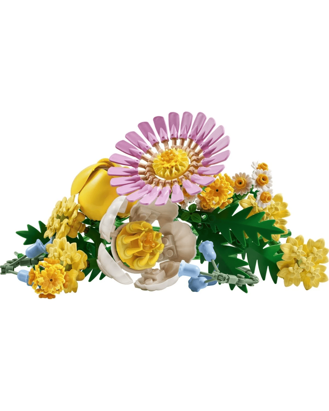 - LEGO flowers - The bouquet blooms with 7 species of spring flowers in pastel shades, including Billy buttons, bluebells, Cleopatra ferns, yellow yarrows, a gerbera, a peony and a tulip