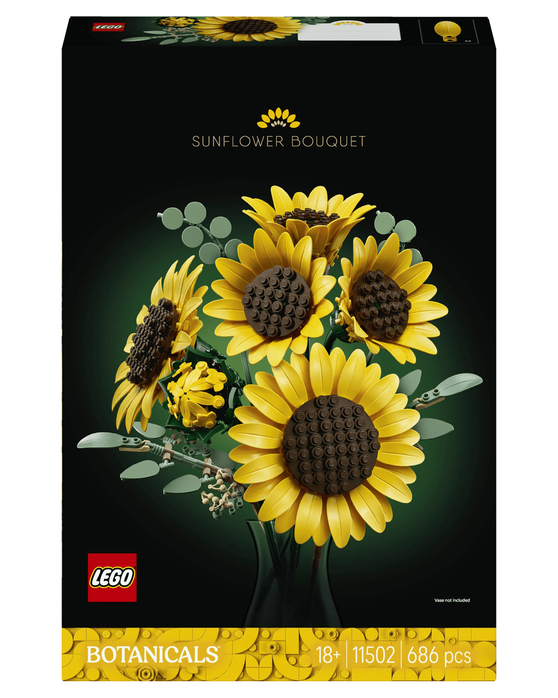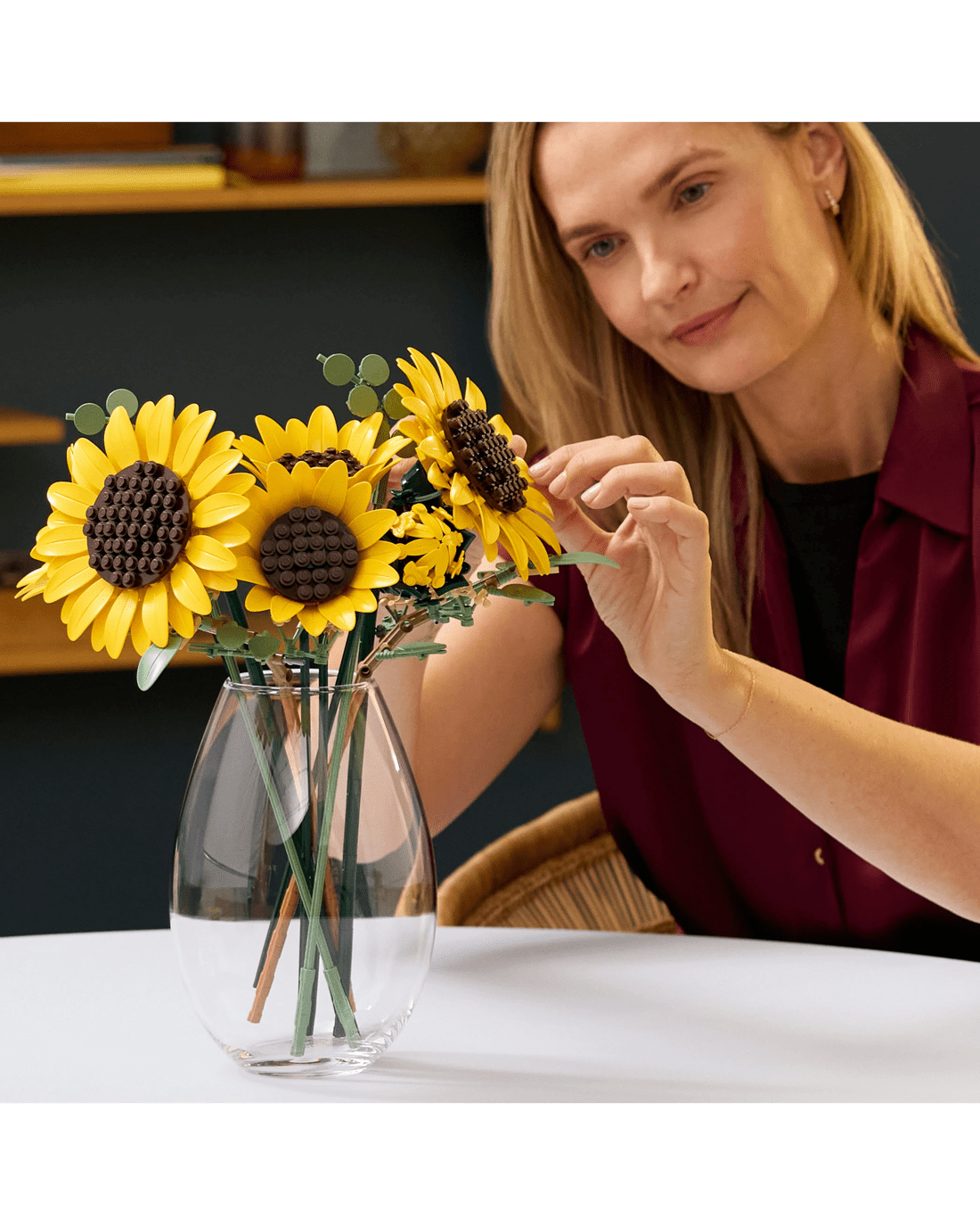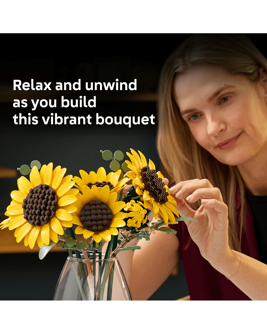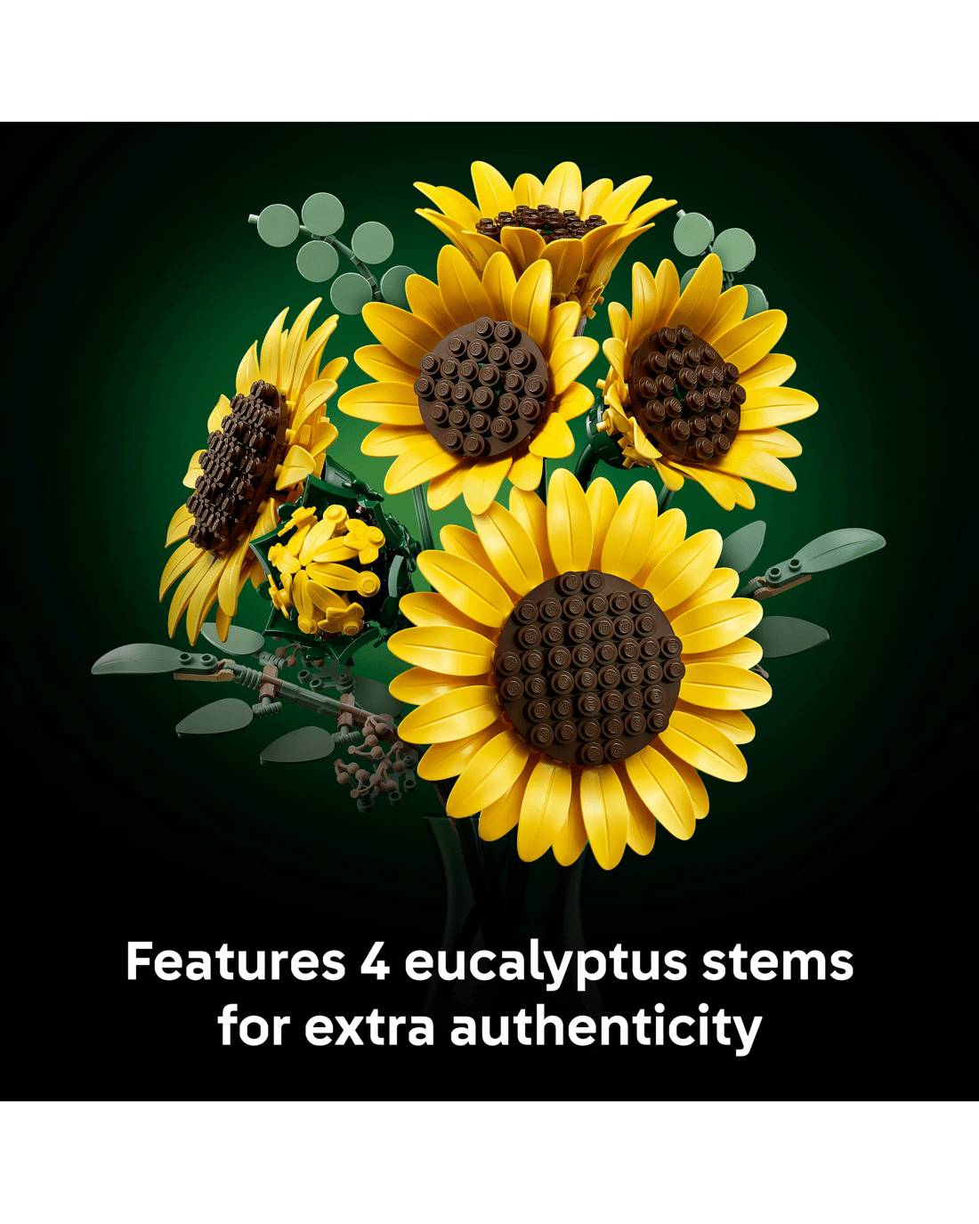 Let your creativity bloom with the LEGO Botanicals Sunflower Bouquet building set for adults. This gorgeous LEGO bouquet includes six sunflowers in various stages of development. Enjoy creating one sunflower bud, three sunflowers beginning to bloom and two big fully opened sunflowers, plus four stems of eucalyptus.