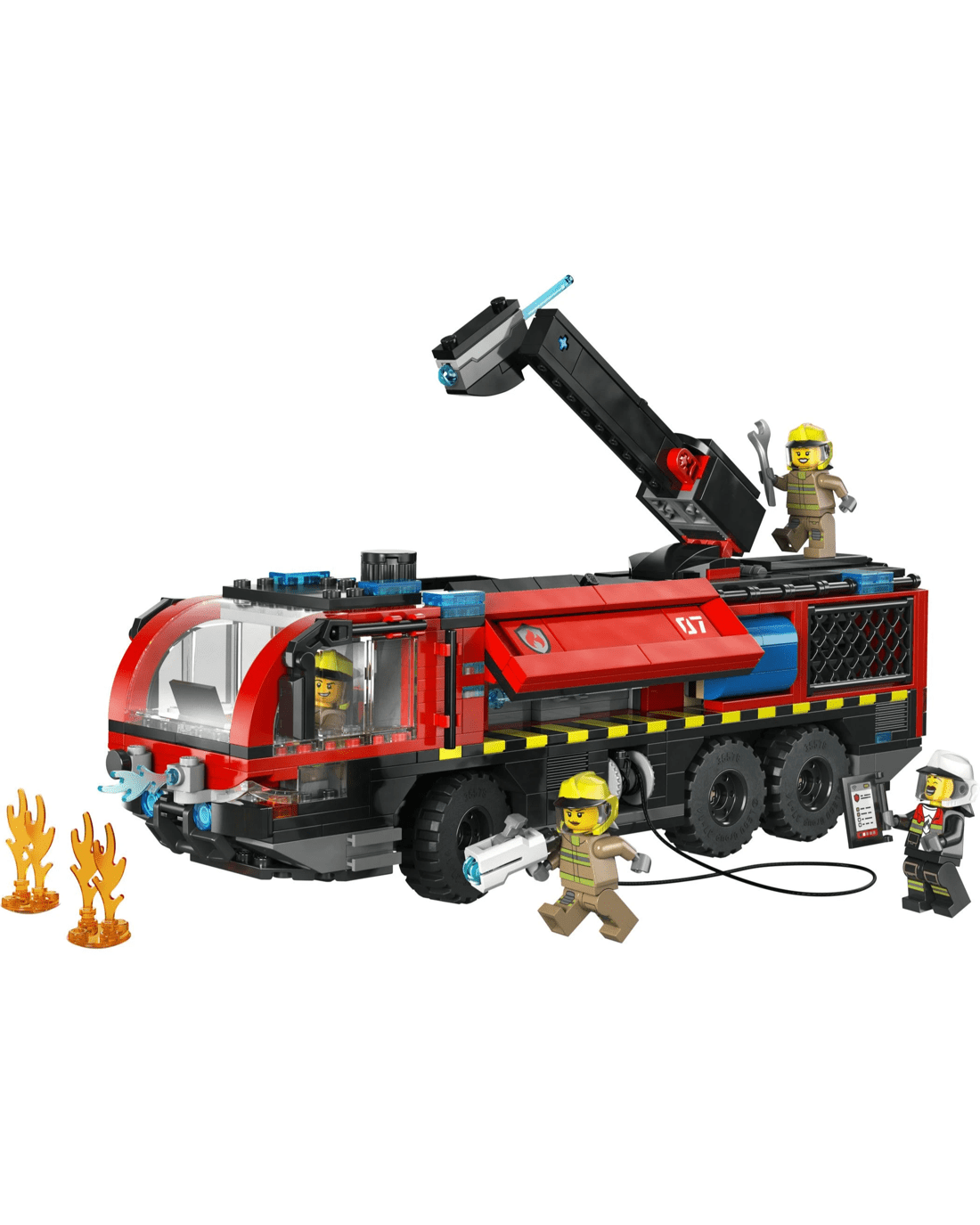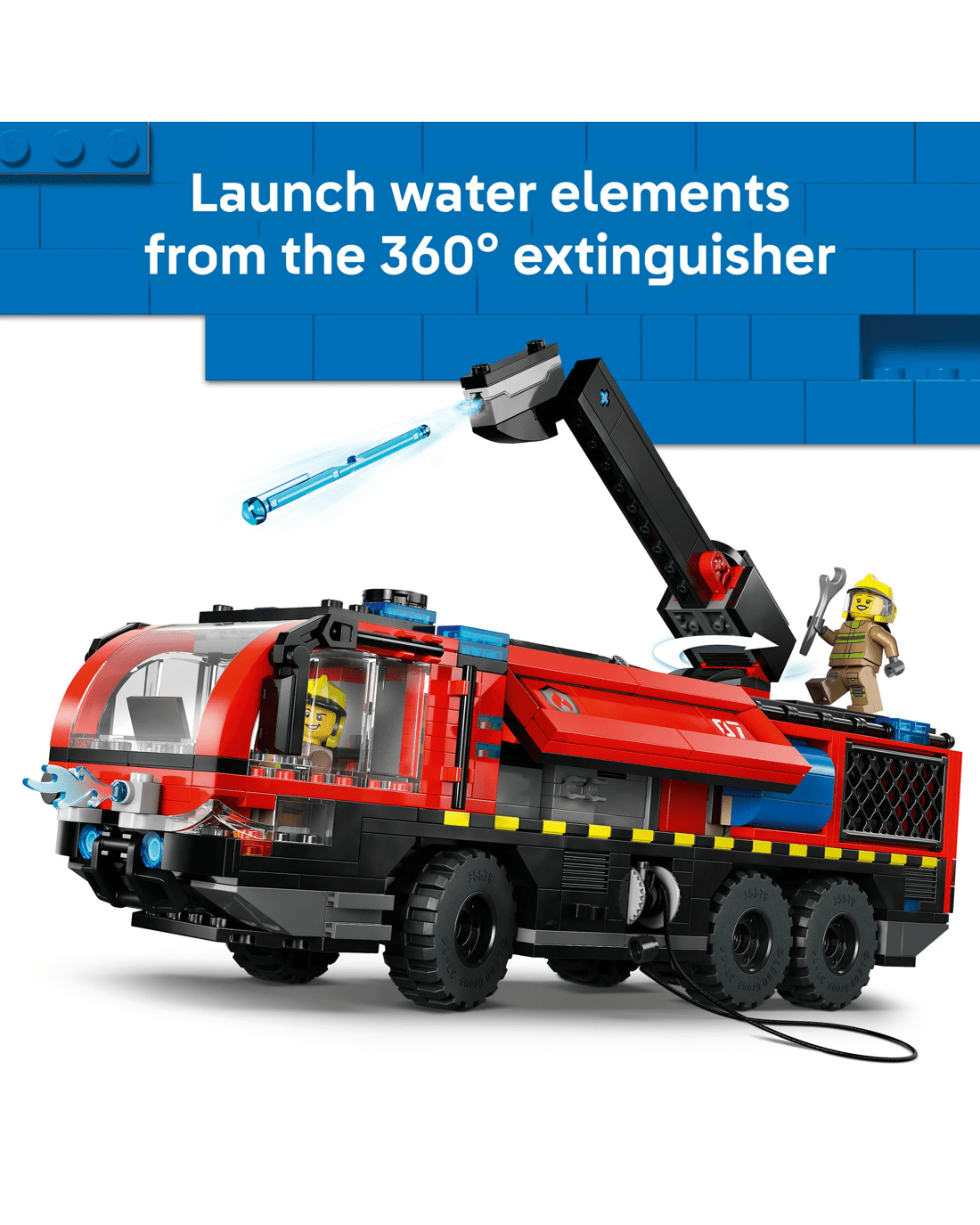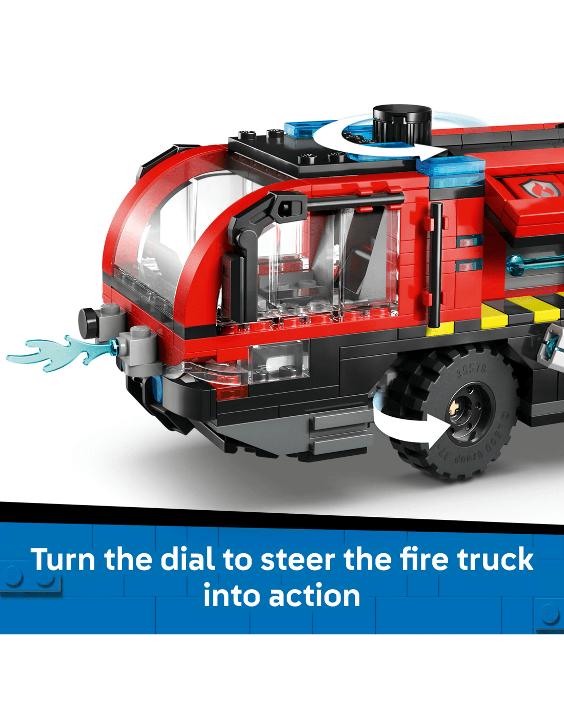 Mobilise the LEGO City Airport Fire Engine for kids. This realistic emergency vehicle toy features a 360 deg. rooftop extinguisher, opening side equipment bays and tool storage compartments. Kids can turn a dial to steer the fire engine, launch water elements from the extinguisher and remove the engine for repairs. The toy truck comes with six chunky rubber tyres and a detailed cab with seating for the four firefighter minifigures. Just add a sprinkle of imagination to ignite hours of heroic firefighting adventures.