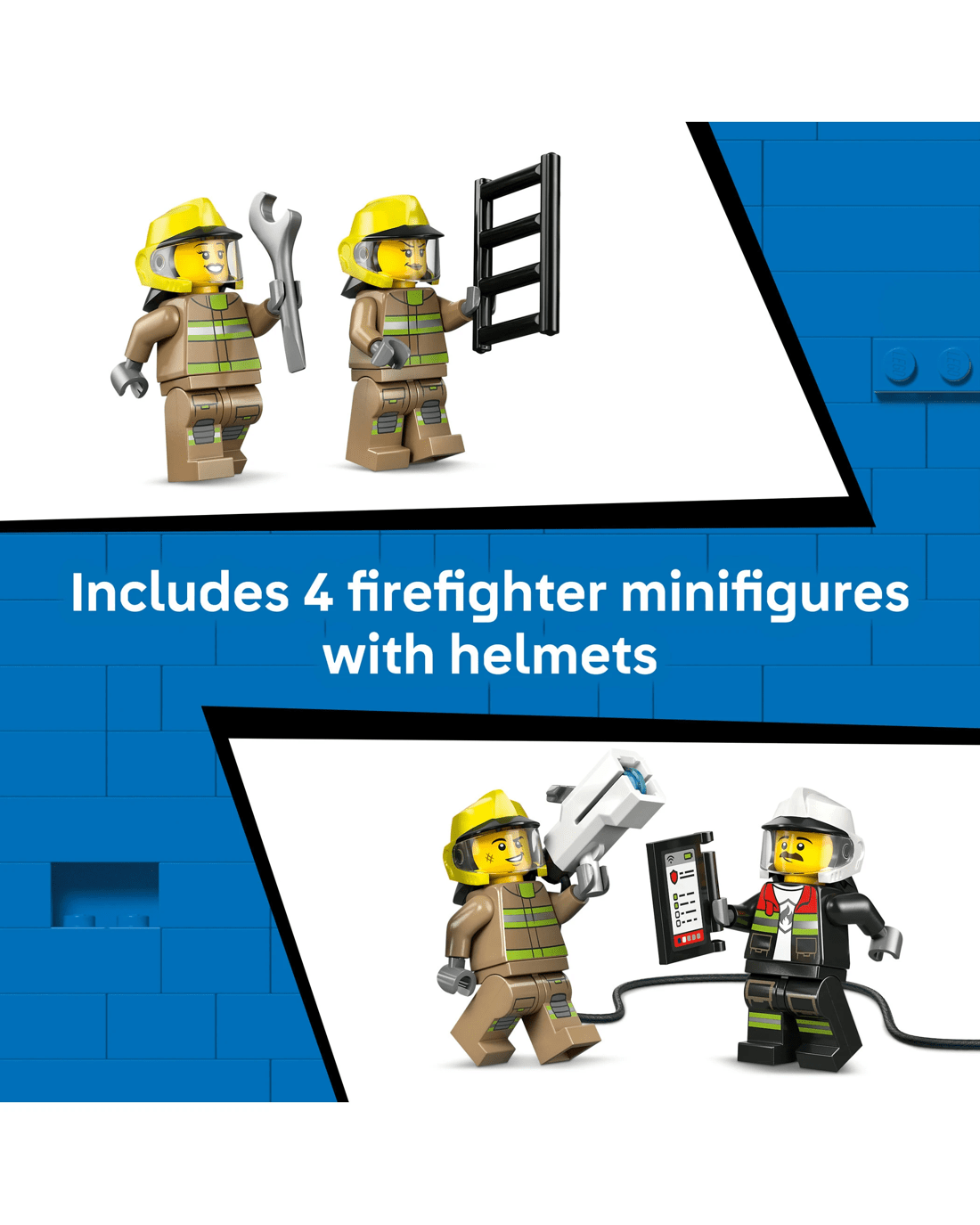 - Minifigure Accessories - This firefighter toy playset comes with LEGO accessories including fire helmets, a wrench and a toy digital pad