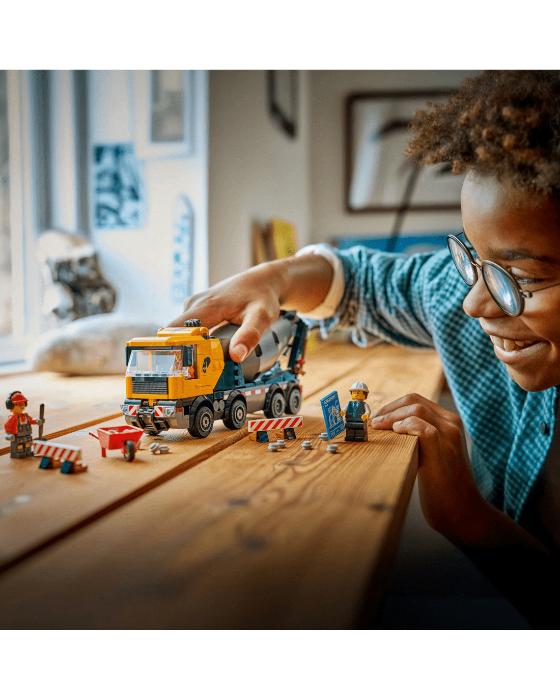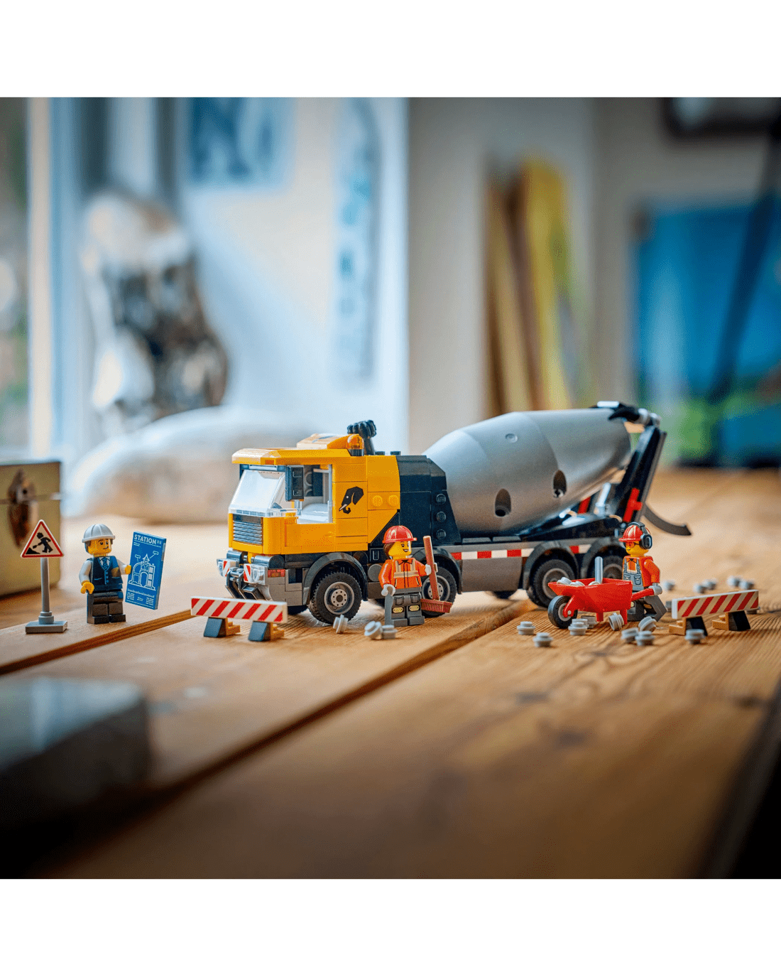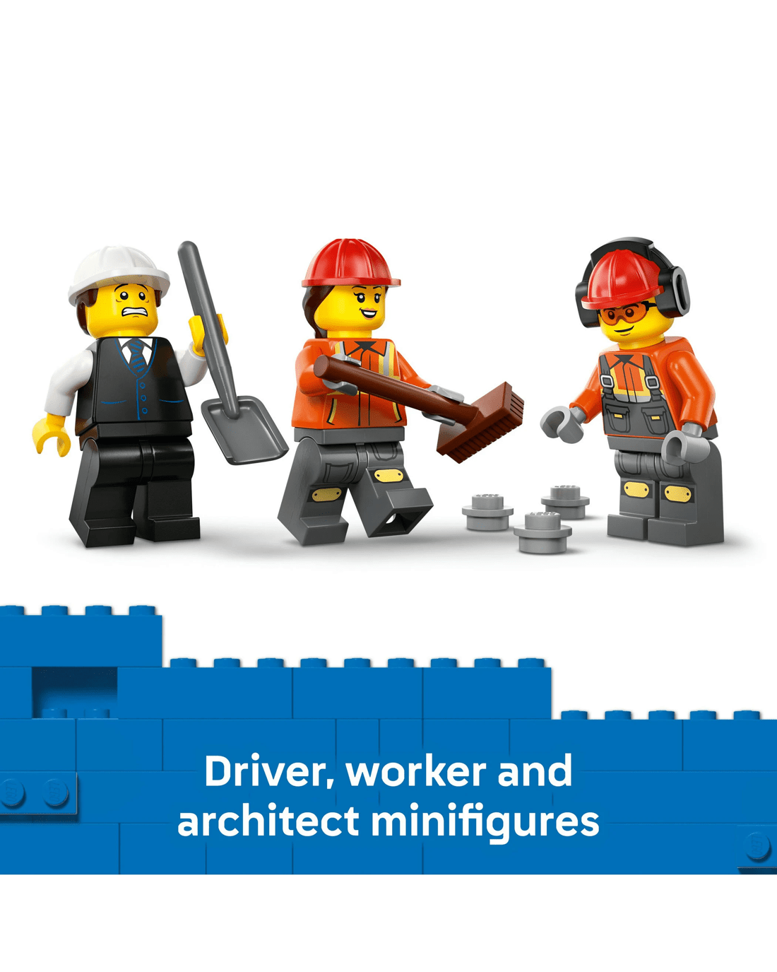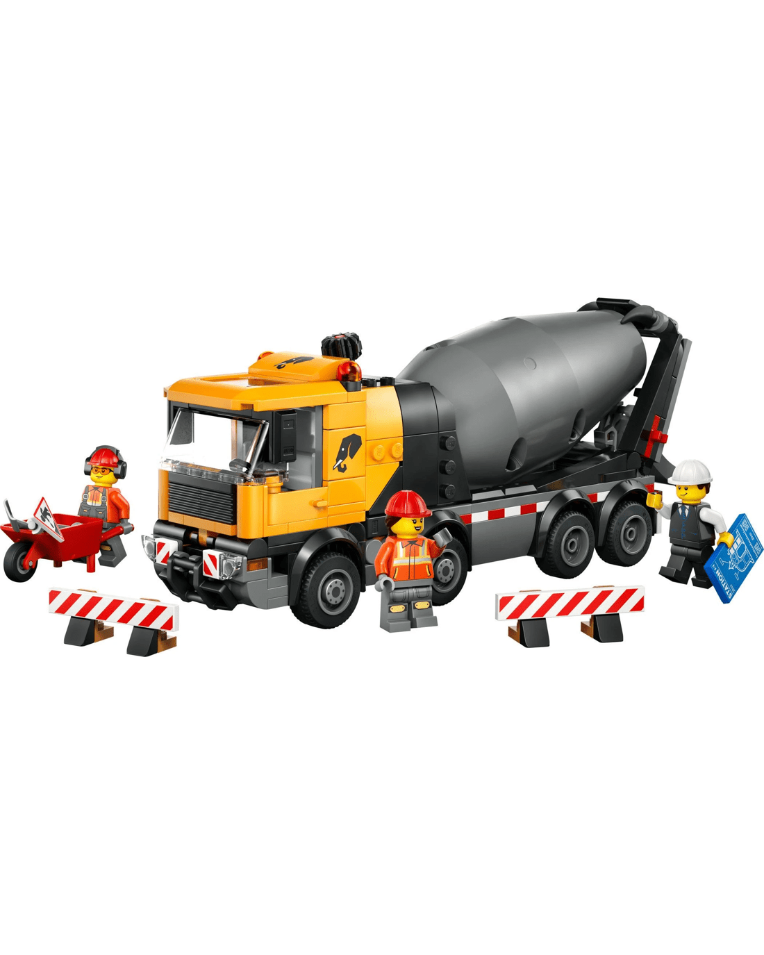 - LEGO Minifigure Accessories - This cement truck model comes with LEGO accessories including a wheelbarrow, road sign, 2 barriers, a clipboard, spade and broom
